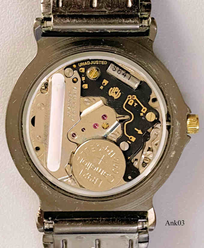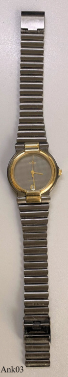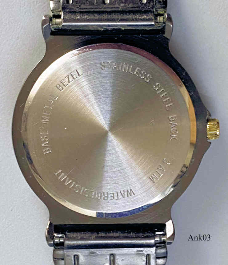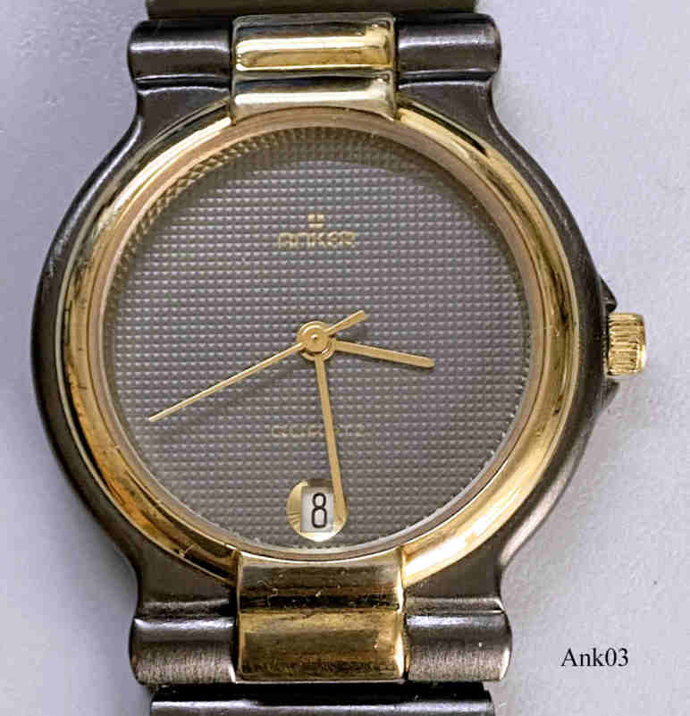 Eine Anker Quartz Herrenuhr im Schwarz/Goldenen Gehäuse mit Datum bei der 6. Sie hat ein ansprechendes schlichtes graues Zifferblatt mit goldfarbenen Zeigern und zentralem Sekundenzeiger. Beschriftet vorn: ”Anker, Quartz”, hinten: ”Base Metal Bezel, Stainless Steel Back, 3 ATM Water Resístant”, innen: ”PUW 240/253N, Unadjusted, Seven 7 Jewels”. Uhrwerk Kaliber PUW 240/253N