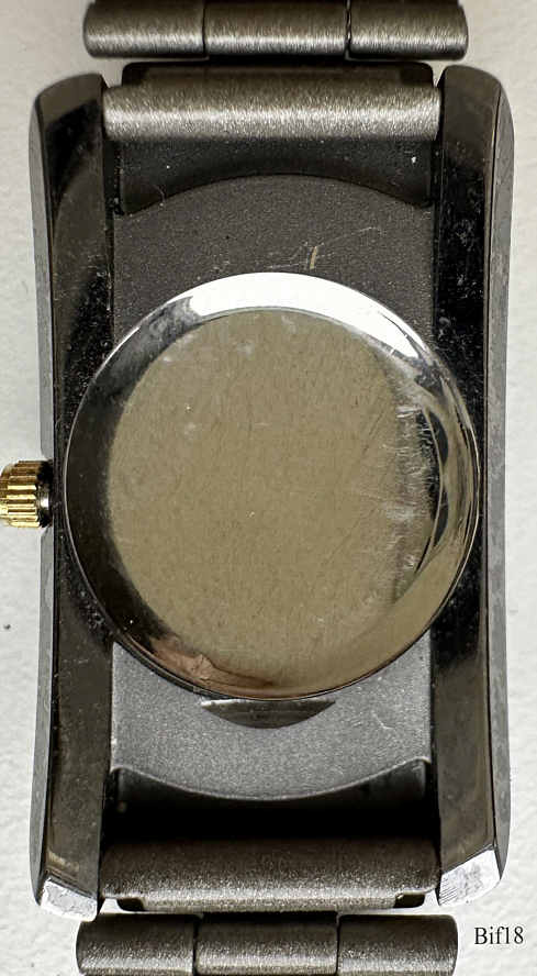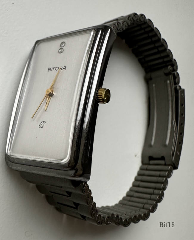 This is a Bifora ladies quartz watch, using a PUW 500 movement and relates to the India manufacturing. Gun metal case, white dial, two points at twelve with central seconds hand. Signed front: ” BIFORA, Q”, back: ” ”, inside: “Unadjusted, PUW 500, five (5) Jewels”. Integrated titanium metal band.