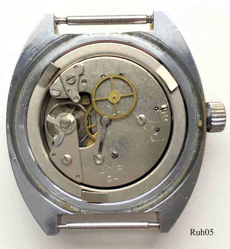 Eine Ruhla Handaufzugs Uhr mit Base Metal Gehäuse und Stainless Steel Back, grünes Zifferblatt, eine Uhr aus der Ruhla UMF Manufaktur. Beschriftung vorn: “Ruhla, Antimagnetic, Made in GDR”, hinten: “Antimagnetic, Inoxydable, Electronically Timed”, innen: “UMF 24”. Kaliber UMF 24-32