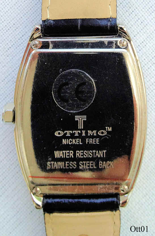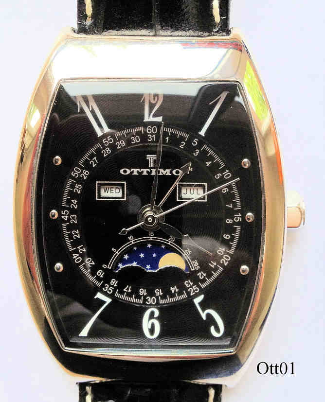 A nice quartz watch of Ottimo from Canada with Miyota Movement. Signed front: “Ottimo”, back: “Ottimo, Nickel Free, Water Resistant, Stainless Steel Back”, inside: “Unadjusted, 6P80, Miyota Co“. Black Dial with two windows for month and day, the date is displayed by a hand. At 6 is the window for the moonphase. Black leather band, Miyota movement 6P80.