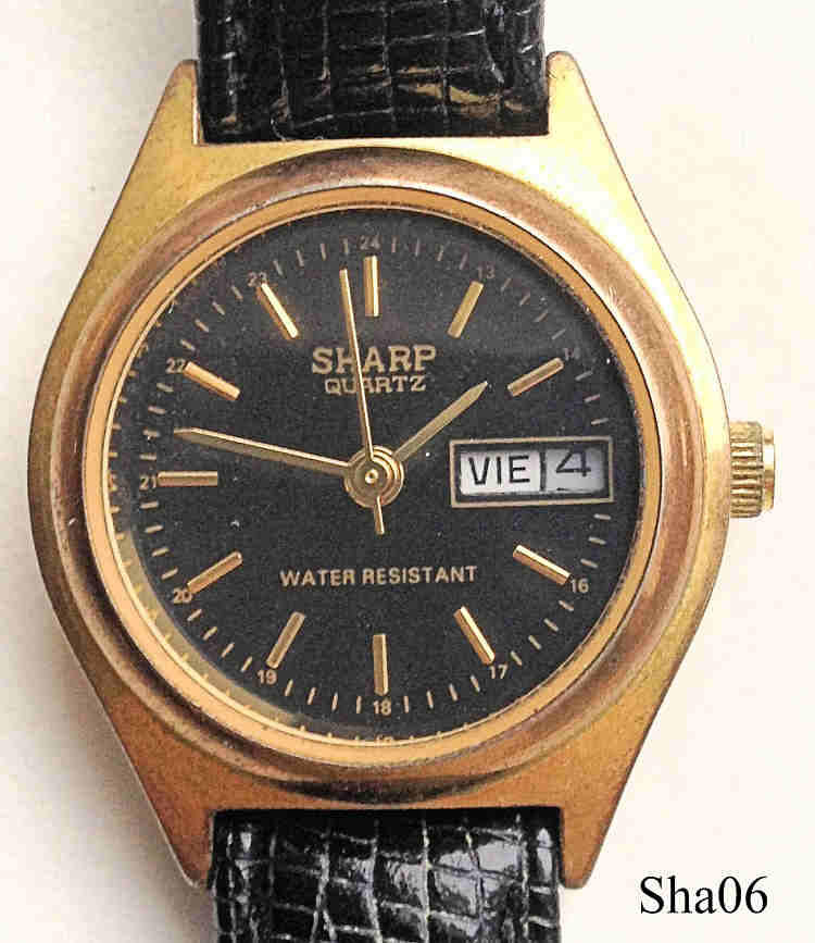 Eine schöne Sharp Damen Quartz Uhr mit Base Metal Gehäuse und Stainless Steel Back. Tag und Datum bei der 3, Beschriftung vorn: ”Sharp, Quartz, Water Resistant”, Rückseite: ”Sharp, 387539, 377, Japan, Stainless Steel Back, Water Resistant”, innen: “No Jewels, Unadjusted, Morioka Tokai Inc., Japan, PC23A, ”. Schwarzes Leder Armband.