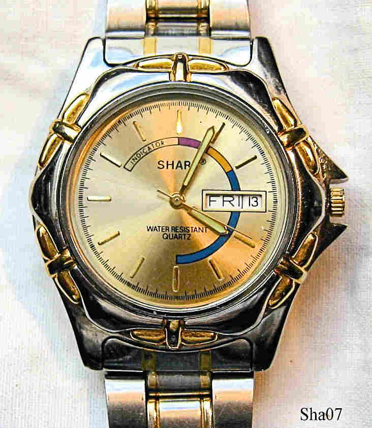 Eine Sharp Quartzuhr mit Base Metal Gehäuse und Stainless Steel Back, Day/Date bei der 3. Beschriftung vorn: ”Sharp, Water Resistant, Quartz”, Rückseite: ”Sharp, Stainless Steel Back, Water Resistant, Japan Movt.”, innen: “SE 310.311, Swiss Ebauches Ltd., Movt China, No 0 Jewels”. Edelstahl Gliederarmband. Unverständlich, daß auf der Rückwand Japan movt. steht und ein Werk der Swiss Ebauches Ltd. aus China verbaut ist! Die Funktion des Anzeigeringes auf dem Zifferblatt ist mir unbekannt..