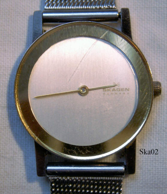 A Skagen ladies design watch with base metal case, signed front: “Skagen, Denmark”, back: “Jorst Intl. Denmark, Case SS Water resistant 100 Ft, Ultra slim, Japan Quartz Movement, Skagen, Denmark, 39SGS”, inside: “Morioka Tokai, VX50E, 1, Japan, No Jewels”. Stainless Steel mesch band.