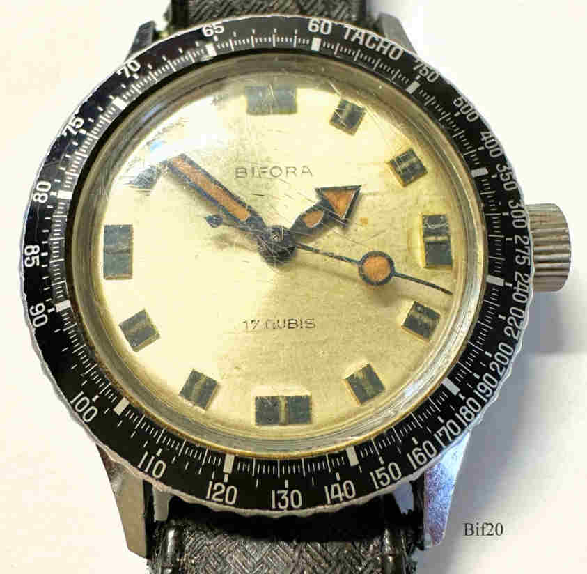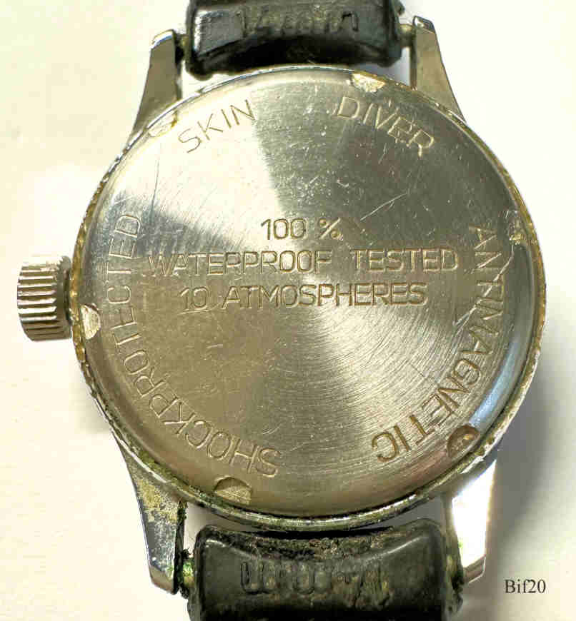 Dies ist eine Bifora Handaufzugs Uhr mit dem Bifora 91/1 Werk, Zentralsekunde, Beschriftet vorn: ”BIFORA, 17 Jewels”, hinten: ”Skin Diver, Shock Protected., Antimagnetic, 100% Waterproof Tested, 10 Atmospheres”, innen: “B, 91/1”. Kaliber: Bifora 91/1 , schwarzes Lederband.