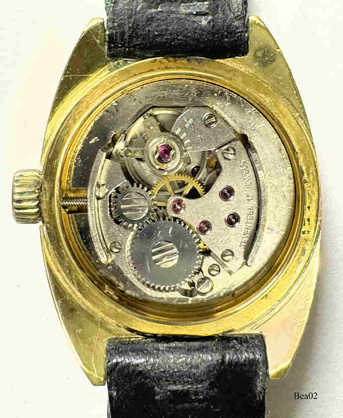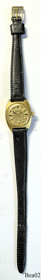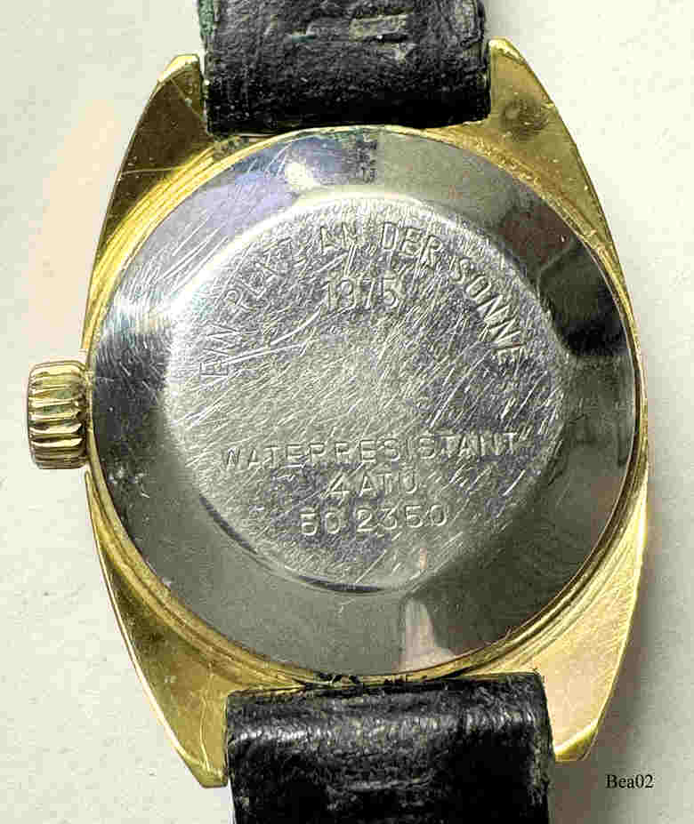 Diese Damenuhr ist einer der Preise bei der deutschen Fernsehlotterie “Ein Platz an der Sonne” in 1975. Beschriftet vorn: “Bergana”, hinten: “Ein Platz an der Sonne, 1975, Water Resistant, 4 ATÜ, 50 2350”, innen: “Int 1977-4, Seventeen 17 Jewels”, Schwarzes Leder Armband, vergoldetes Gehäuse. Kaliber DuRoWe 1977-4