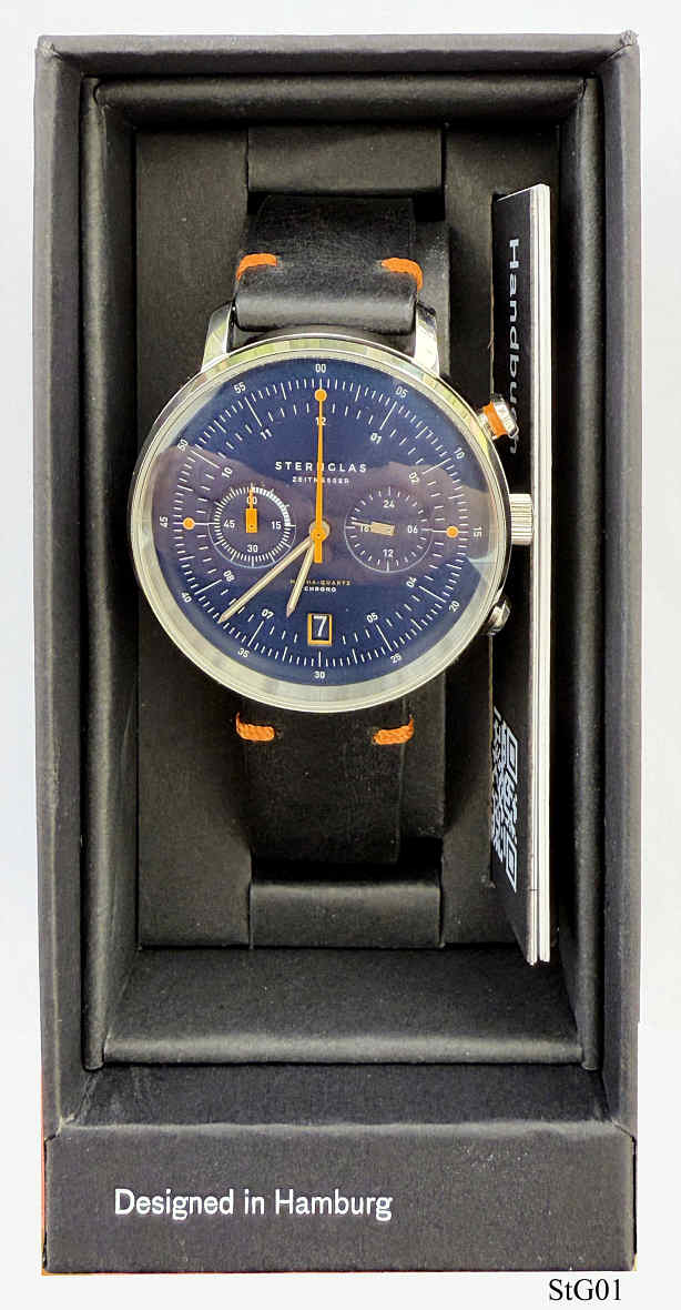 Ein Quartzchronograph im Nostalgie Look der Firma Sternglas. Dies ist eine relativ neue Designfirma in Hamburg. Edelstahl Gehäuse mit zwei ”Augen”, wie bei den früheren mechanischen Chronographen, Datum bei der 6. Schwarzes Lederarmband mit orangenen Applikationen. Beschriftung vorn: “Sternglas, Zeitmesser, Mecha-Quartz, Chrono”, hinten: ”Sternglas, Gestaltet in Hamburg, 5 ATM Wasserdicht, 72.01.2407.0243”. innen: “ VK64A, No Jewels, Japan, 3”.