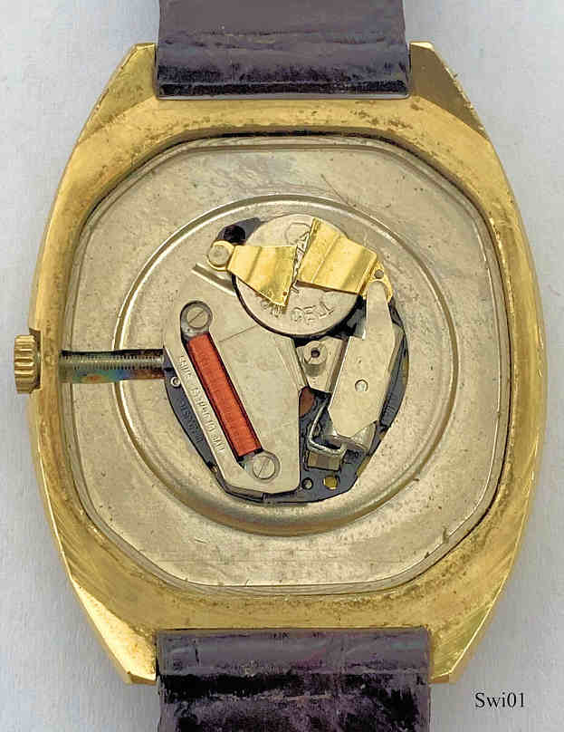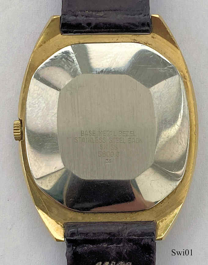 Eine Swissonic Quartzuhr, römische Ziffern auf goldfarbenem Zifferblatt. Aufschrift vorn: “Swissonic, Quartz, Swiss”, hinten: ”Base Metal Bezel, Stainless Steel Back, Swiss, 5600.3, 38”, innen: “Unadjusted, ESA 9220, Five (5) Jewels, Swiss”, Braunes Lederarmband.