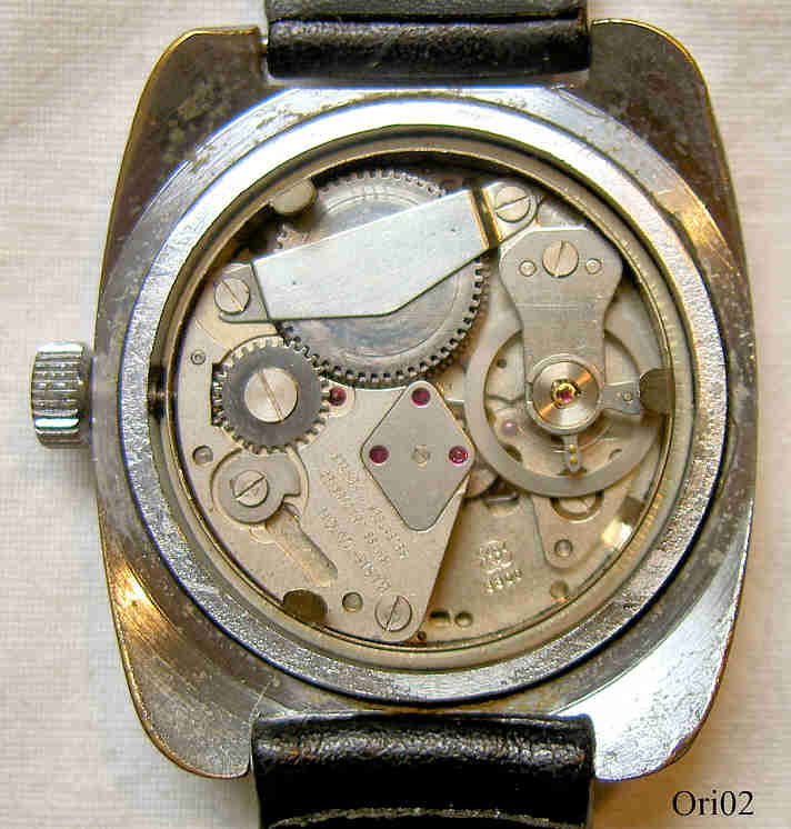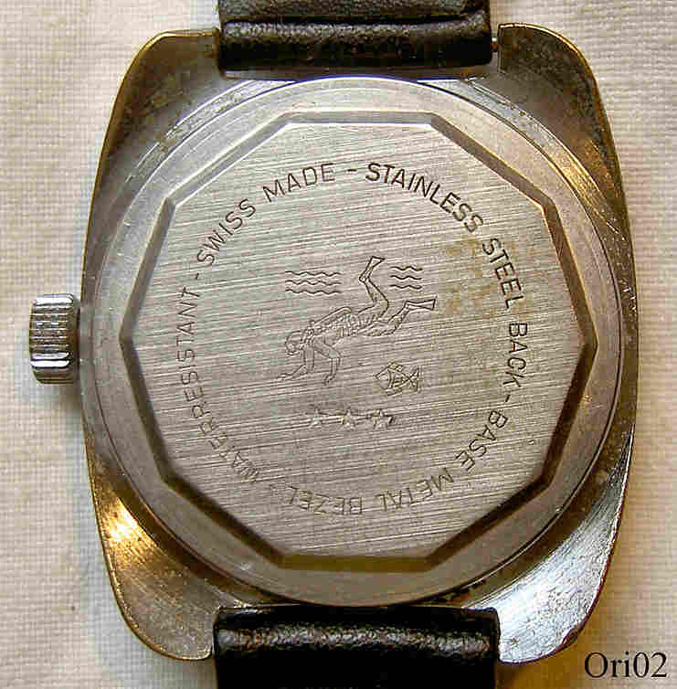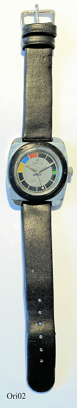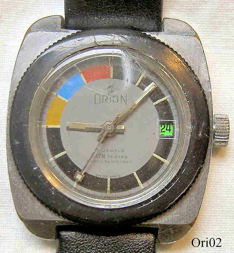 Eine Orion Taucheruhr mit Handaufzugs Werk. Base Metal Gehäuse in silberfarben mit schwarzem Lederarmband. EB Werk Kaliber EB 8800, 17 Steine, Datum bei der 3. Beschriftet: ”Orion, 17 Jewels, 5 ATM Tested, Shock Resistant, Swiss Made”, innen: ”Basis Watch, Swiss unadjusted, seventeen 17 Jewels, EB 8800”, hinten: ”Water Resistant, Swiss Made, Stainless Steel Back, Base Metal Bezel”. Werk Ebauches Bettlach 8800