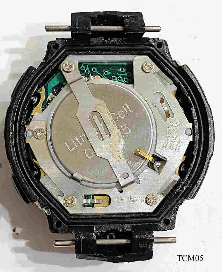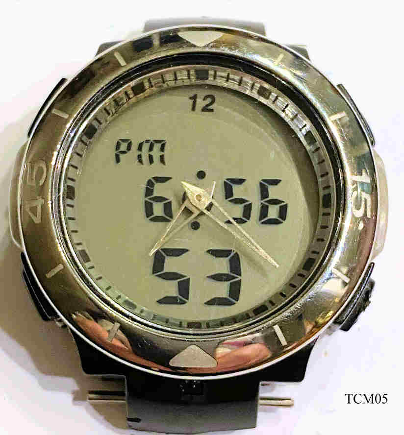 Eine Tchibo Analog / Digital Uhr in futuristischem Design mit Spiegel-Zifferblatt und Kunststoff Gehäuse. verspiegeltes Zifferblatt als LCD Anzeige. Beschriftet vorn: ” ”,  hinten: ”TCM, 209546, Stainless Steel Back, Shock Resistant, Wasserresistant 30m, Batterie Type CR 2025”, innen: “No Jewels, Unadjusted, China, Chung’s”