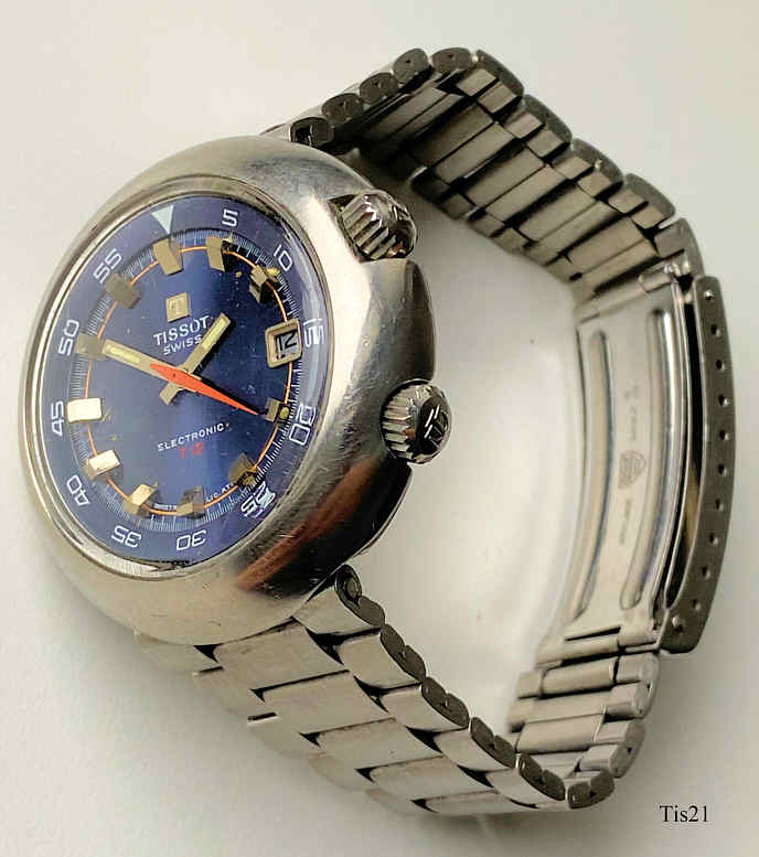 Eine Tissot Electronic T12 im Taucherdesign. Werk Caliber ETA9150, Gehäuse Stainless Steel, Boden ist nicht Original. Beschriftet vorn: ”Tissot, Swiss, Electronic, T12, Swiss T Made Lic. ATO”, innen: “Swiss, Thirteen (13) Jewels, Unadjusted, 12344929”. Metall Gliederarmband mit Tissot Schließe, Datum bei der 3. Die obere Krone verstellt den äußeren Minutenring.