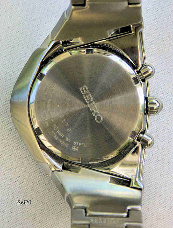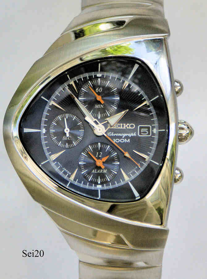 Ein Seiko Ventura Alarm Chronograph mit Edelstahl Gehäuse und Back. Kaliber Miyota 7T62, Datum bei der 3, Beschriftung vorn: “Seiko, Chronograph, 100M, Mvt.Japan, 7T62 0JJB HR 2”, hinten: “ Seiko, 770178, Water Resistant, 10 Bar, StainlessSteel, Movement Japan, 7T62 - 0GH0, A0”. spezielles, der Form der Uhr angepaßtes Edelstahl Armband. Funktionen: Uhrzeit / Kalender, Alarm, Stoppuhr, zweite Zeitzone. Alarm Einstellung und zweite Zeitzone wird auf dem unteren kleinen Zifferblatt eingestellt, Stoppuhr bis 30 Minuten, der Zentral-Sekundenzeiger zeigt 1/10 Sekunde und das obere Zifferblatt die Minuten bis 60. Das mittlere Zifferblatt zeigt die Sekunden. Diese Uhr ist eine Design Hommage auf die legendäre Hamilton Pacer / Ventura, eine der allerersten elektrischen Armbanduhren der Welt.