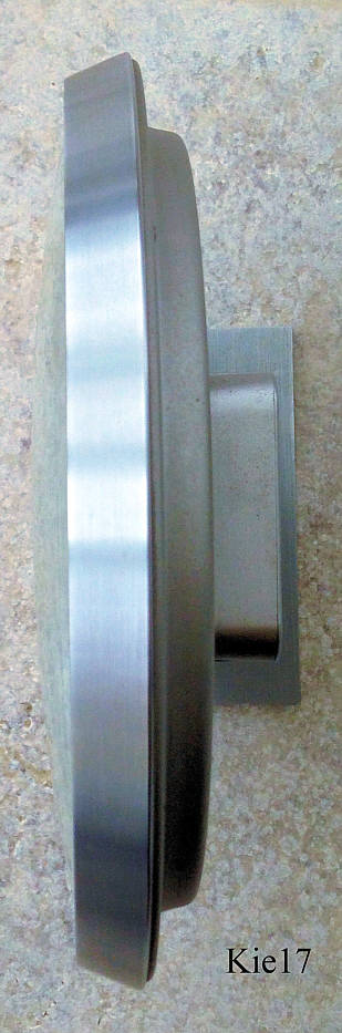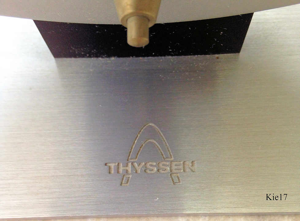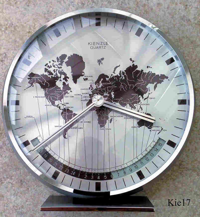 A Kienzle Worldtime Desk clock as a business gift from Thyssen Steel. Metal case with silver dial, printed world map with time zones. Between 4 and 8 a time scale, where the actual time of the respective time zone can be read. On the back side of the socket the Thyssen logo is engraved. Signed front: “Kienzle, Quartz”, back: “Kienzle, Quartz, Germany “.