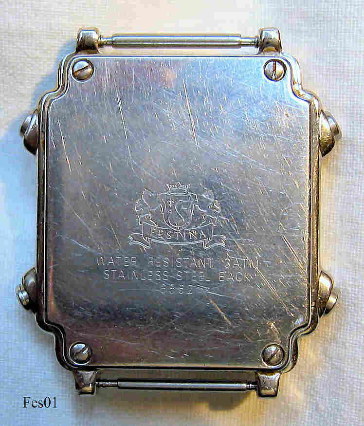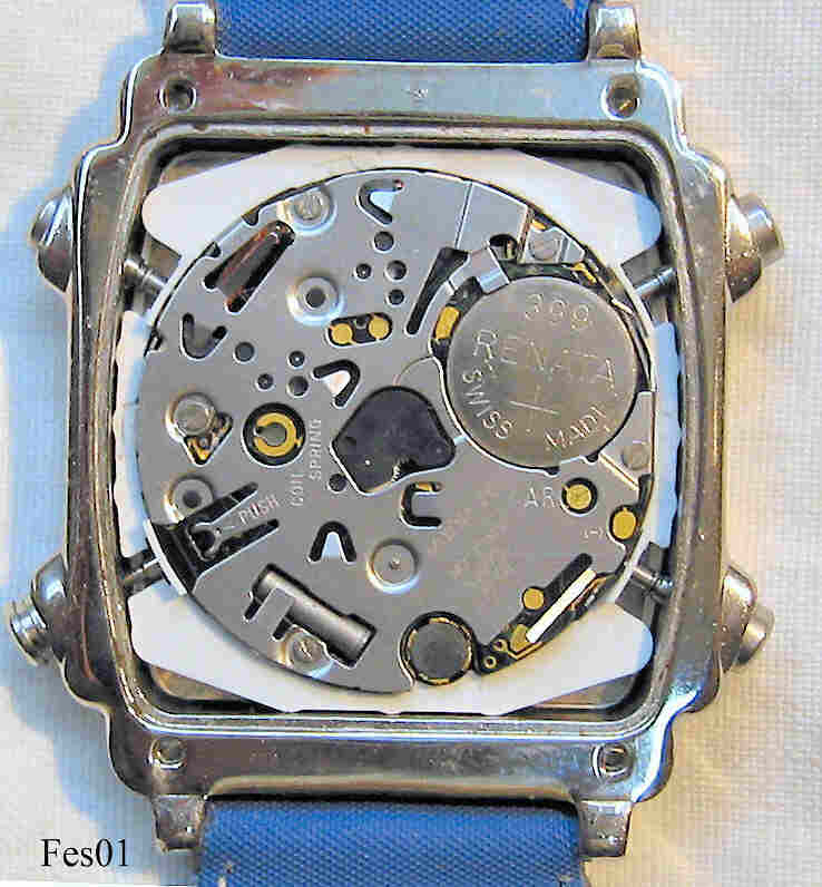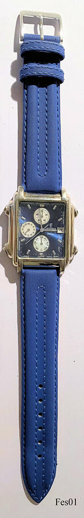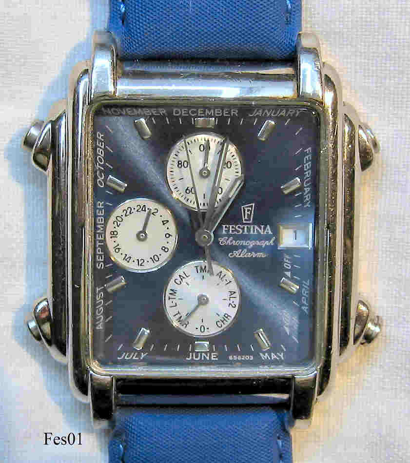 Ein Chronograph von Festina, drei Chronographenskalen mit Perlmutt Hintergrund. Beschriftet: “Festina, Chronograph, Alarm, Januar bis Dezember, 656203”, hinten: ”Festina, Water Resistant 3 ATM, Stainless Steel Back, 6562”, innen: “Miyota Co., No Jewels, 6W70, Japan”. Es handelt sich hier um ein sehr komplexes Uhrwerk, Monatsanzeige durch den Sekundenzeiger, alle Funktionsdaten werden mit den Analogzeigern angezeigt, die Funktionswahl erfolgt über den rechten unteren Drücker und wird auf der unteren Chronoskala angezeigt.