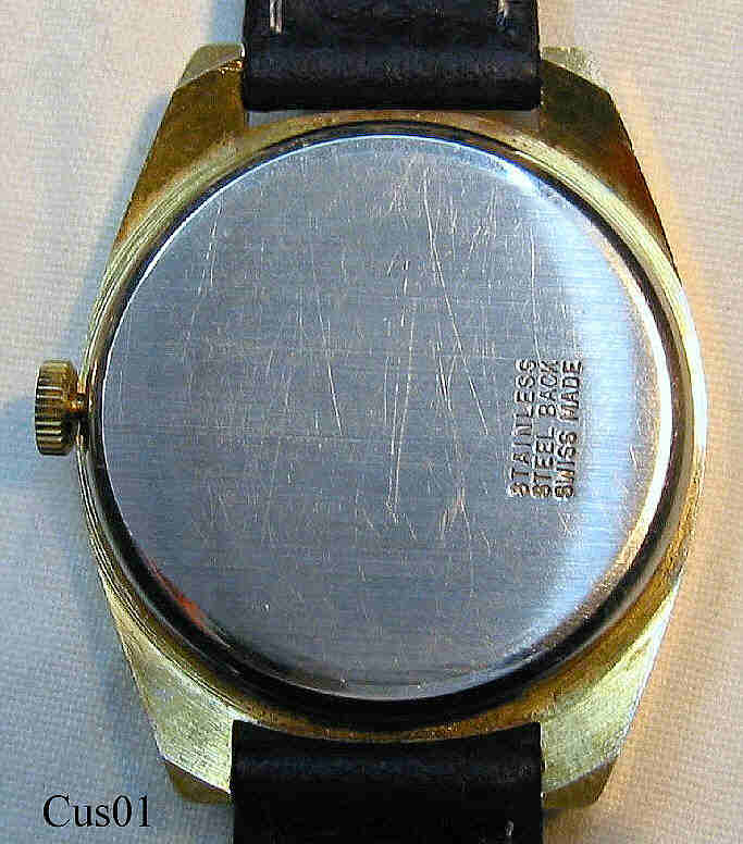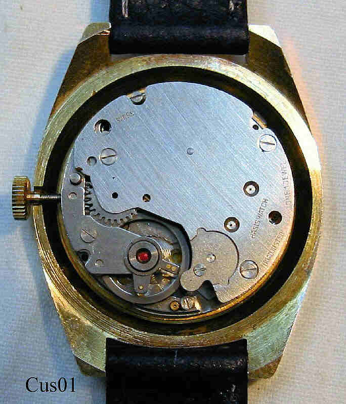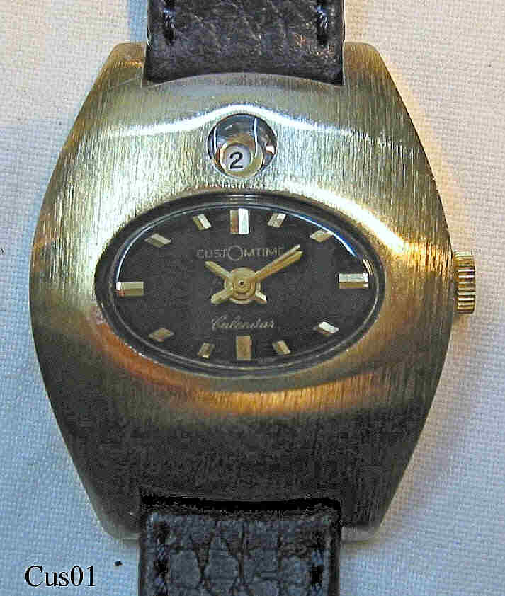 Dies ist eine CustOmtime Schmuckuhr mit vergoldetem Base Metal Gehäuse. Das Zifferblatt ist matt schwarz, das Besondere ist das Bullauge für die Datumsanzeige. Beschriftet vorn: ”CustOmtime, Calendar ”, Rückseite:” Stainless Steel Back, Swiss made”, innen: “Basis Watch, Unadjusted, One Jewel, Swiss”. Schwarzes Lederarmband.