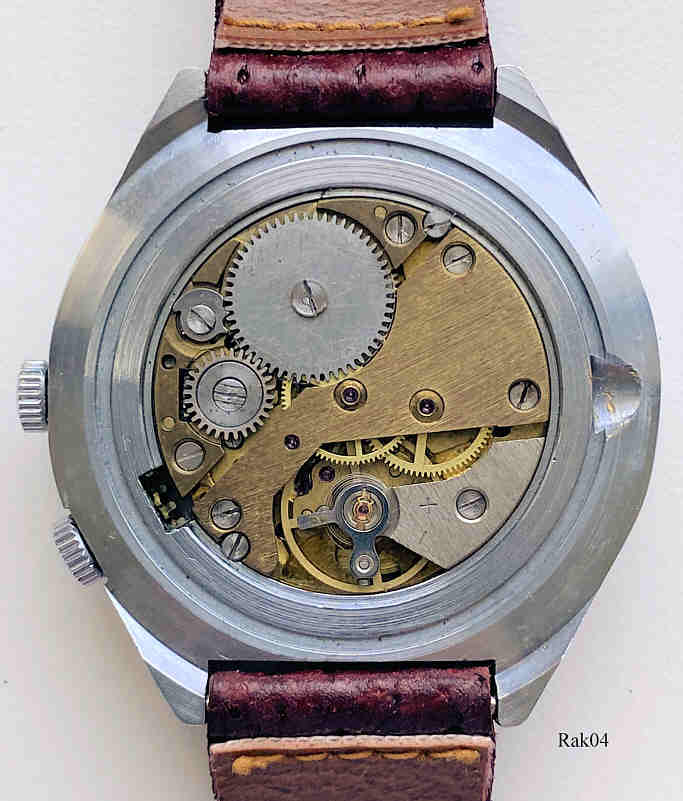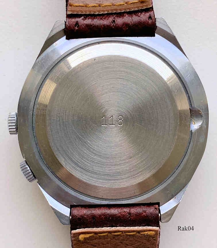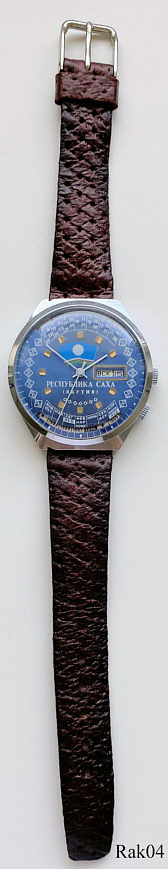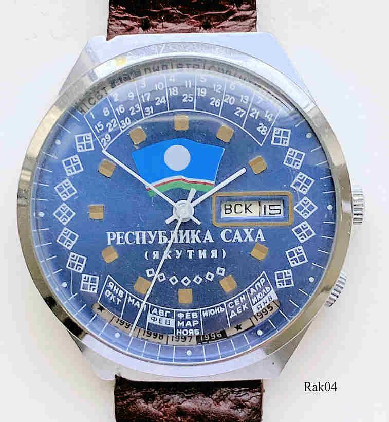 Dies ist eine Raketa Kalenderuhr, Caliber 2614. Beschriftung:”russisch”, Rückseite:” 118”, Bei der “6” ist die Jahreszahl auf den entsprechenden Monat einzustellen, entsprechend zeigt dann bei der “12” der Wochentag auf das jeweilige Datum. Edelstahl Gehäuse, gedrückter Boden, rotbraunes Lederarmband.