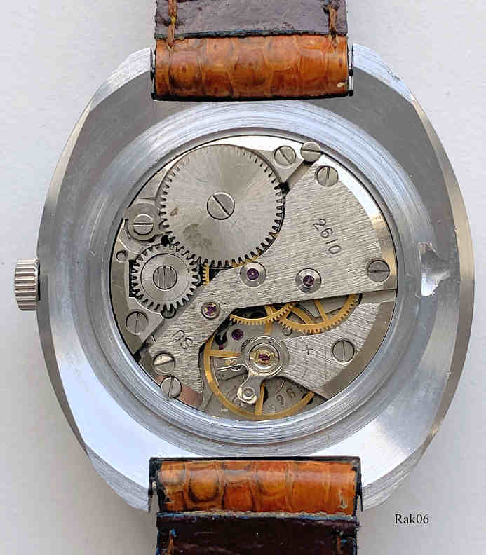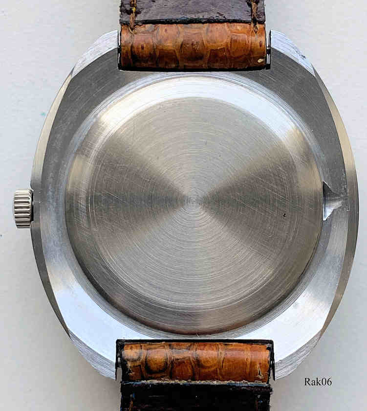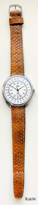 Dies ist eine Raketa 24 Stunden Uhr, Caliber 2610. Beschriftung vorn: “Logo, Made in USSR”, Rückseite: “ “, innen: ”2210”. Der Ãußere Ring zeigt die 24 Stunden Einteilung, der innere Ring zeigt die Minuten. Edelstahl Gehäuse, gedrückter Boden, braunes Lederarmband. Diese Uhr habe ich 2011 in Peterhof nahe der ehemaligen Raketa Fabrik gekauft.