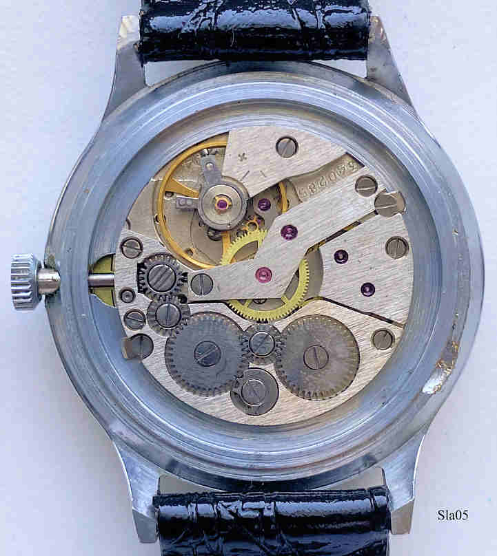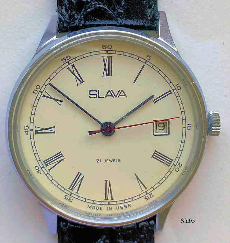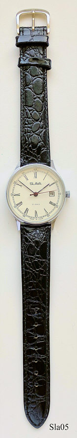 Eine russische Slava Herrenuhr mit Edelstahl Gehäuse, weißes Zifferblatt mit schönen römischen Ziffern, 21 Steine, sehr schön verarbeitet, Kalender bei 3, schwarzes Lederarmband. Kaliber 2414. Beschriftung auf dem Zifferblatt: ”SLAVA, 21 Jewels, Made in USSR”. Beschriftung auf der Rückseite: ”984769”, innen: ”2414, 340285”. Dieses Werk hat zwei Federhäuser und daher eine sehr lange Laufzeit.
