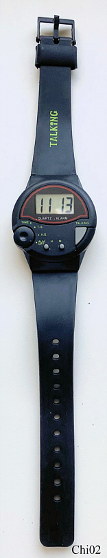 Eine sprechende Armbanduhr aus China. Beim Drücken auf den rechten “Talking” Knopf sagt die Uhr in deutsch die Zeit an. Der linke Knopf stellt den Modus ein: Zeitanzeige, Zeit Stellen, Alarm stellen, Alarm aus. Die beiden Stellknöpfe sind für Stunden und Minuten Einstellung. Kunststoff Gehäuse mit Kunststoff Armband.