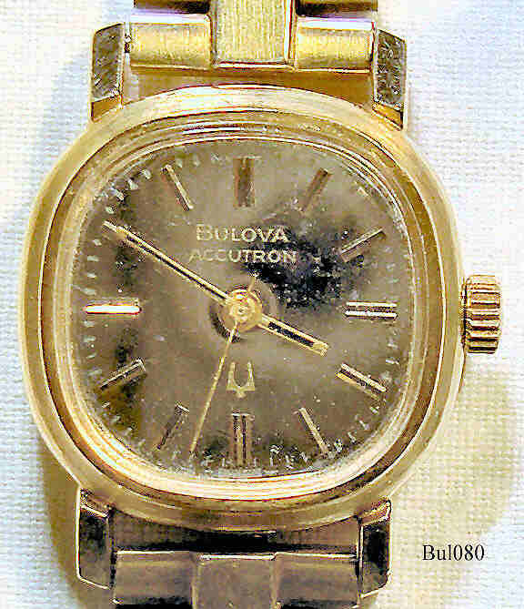 Bulova Accutron ladies watch with gold filled case and mirror dial, signed front: “Bulova, Accutron”, back: “Bulova, N4, G96755, 10K R.G.P. Back, Gold Electroplated Bezel, N4”, inside: “Patent, BulovaWatch Co., Swiss 13 Thirteen Jewels, Unadjusted N4, 2301”, Caliber 2301, date of manufacture 1974 (N4), 10K gold filled Baldwin metal band.