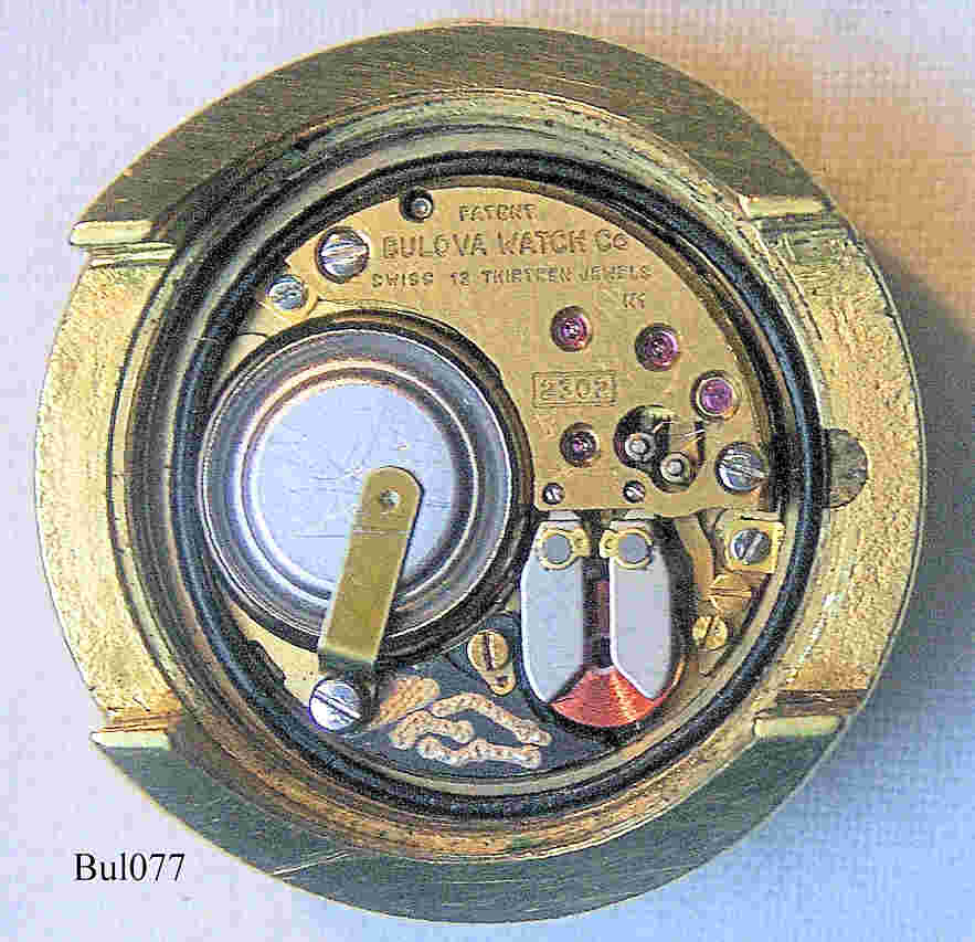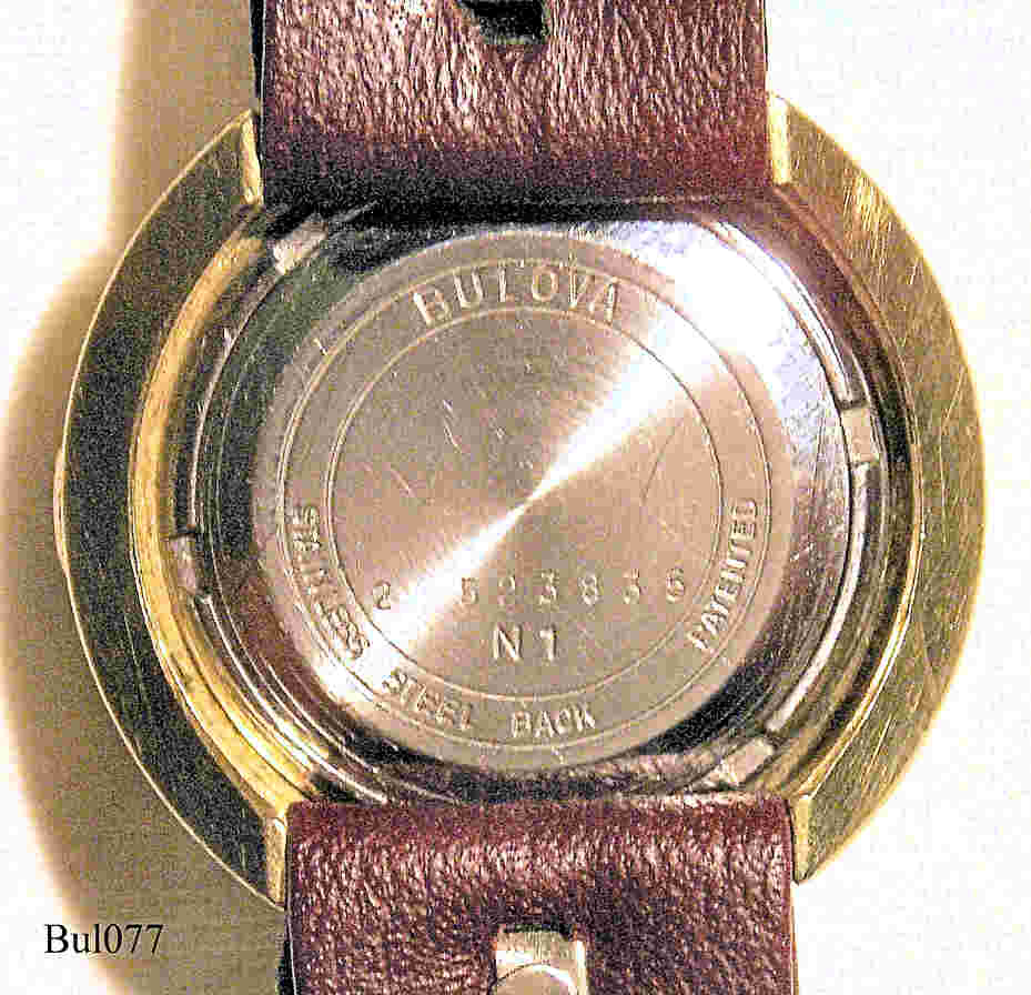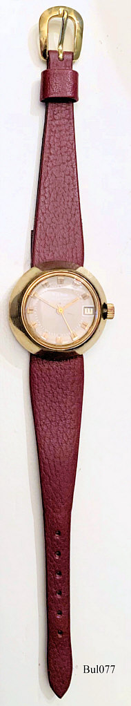 Eine Bulova Accutron Damenuhr mit vergoldetem Gehäuse, Beschriftet vorn: “Bulova, Accutron”, hinten: ”Bulova, Stainless Steel Back, Patented, N1, 2 523835”, innen: ”Patented, Bulova Watch Co., N1, Swiss, Thirteen 13 Jewels, 2302”, Caliber 2302, Herstelldatum 1971 (N1), Datum bei der 3, schweres, braunes Lederarmband.