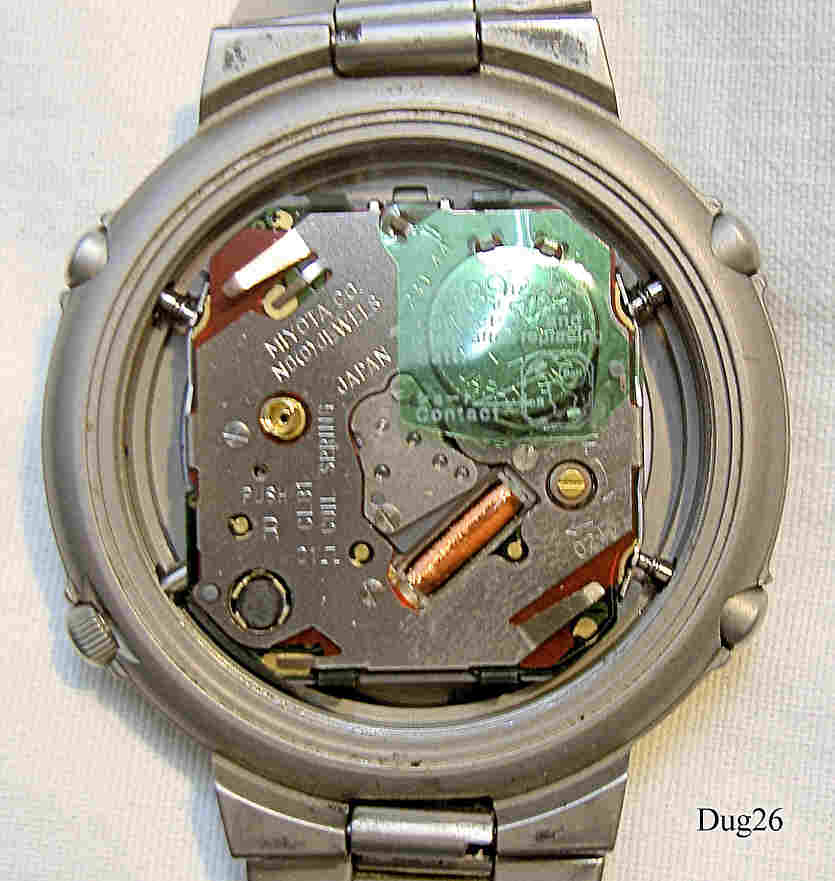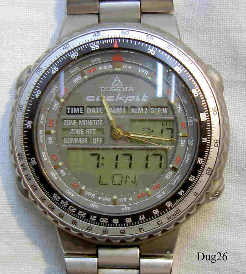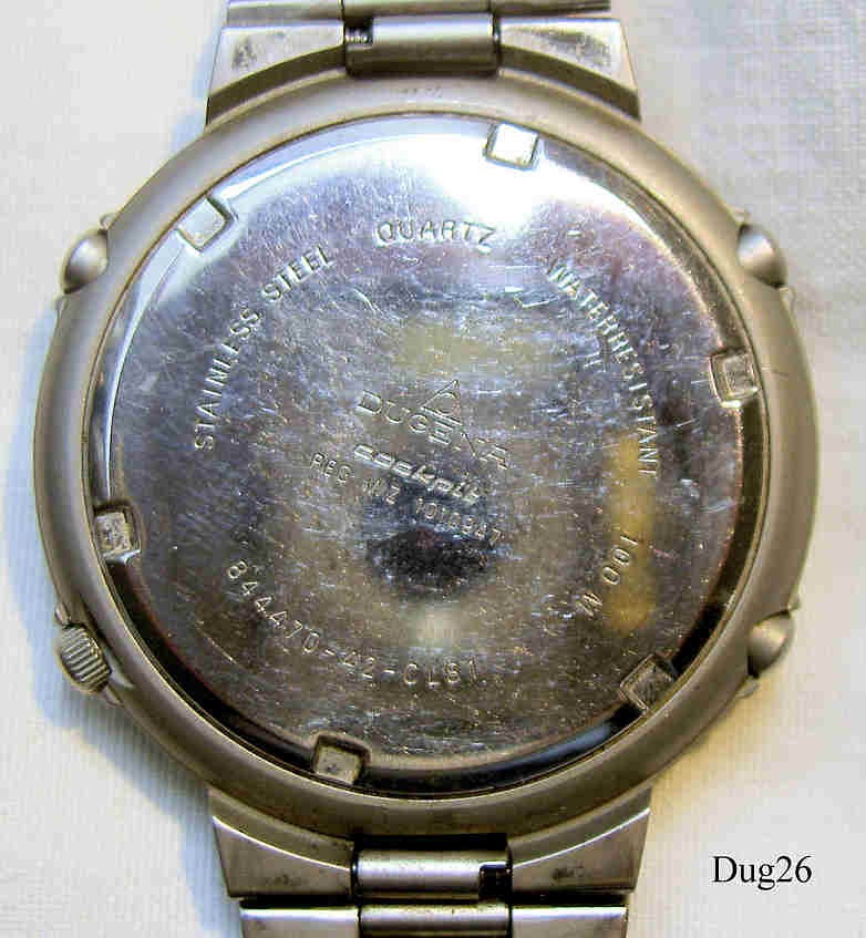 Ein Dugena Chronograph mit Edelstahl Gehäuse und Stainless Steel Back. Kaliber Miyota 281-44, Beschriftung vorn: “Dugena, Cockpit, Funktionsbezeichnungen” hinten: ”Dugena, Cockpit, Reg. Wz. 1010947, Stainless Steel, Quartz, Water Resistant, 100M, 844470-42-CL81”, innen: “Miyota Co., No (0) Jewels, Japan, 281 44”. Dugena Edelstahl Armband mit Dugena Schließe.