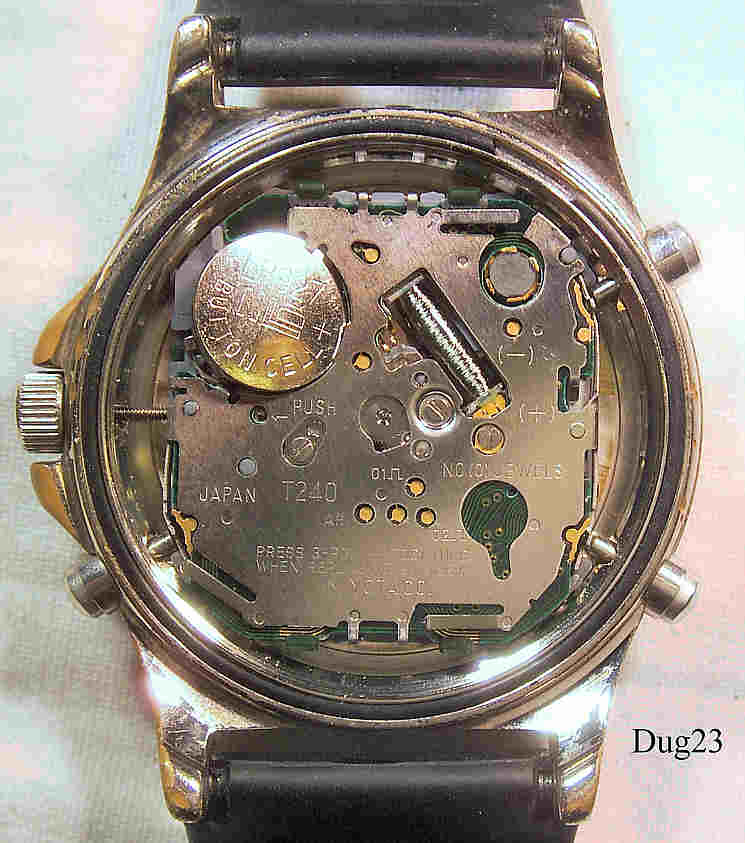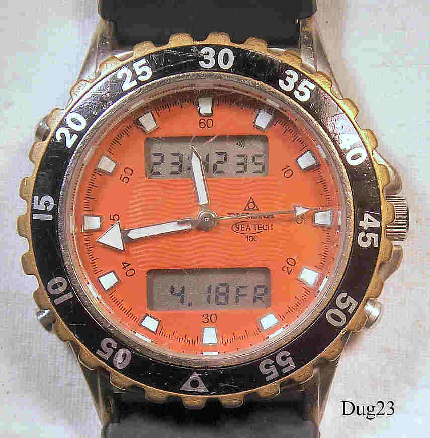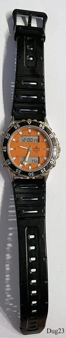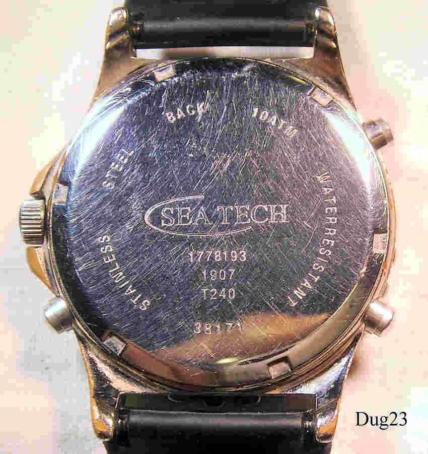 Ein Dugena Chronograph “Sea Tech” mit Edelstahl Gehäuse und Stainless Steel Back. Kaliber Miyota T240, zweite Zeitzone und Datum als LCD Feld bei der 12 und 6, Beschriftung vorn: “Dugena Sea Tech,100”, hinten: ”Stainless Steel Back, 10 ATM, Water Resistant, 38171, Sea Tech, 1778193, 1907, T240”, innen: “No (0) Jewels, Japan, T240, Miyota Co.”, schwarzes Kautschuk Armband.