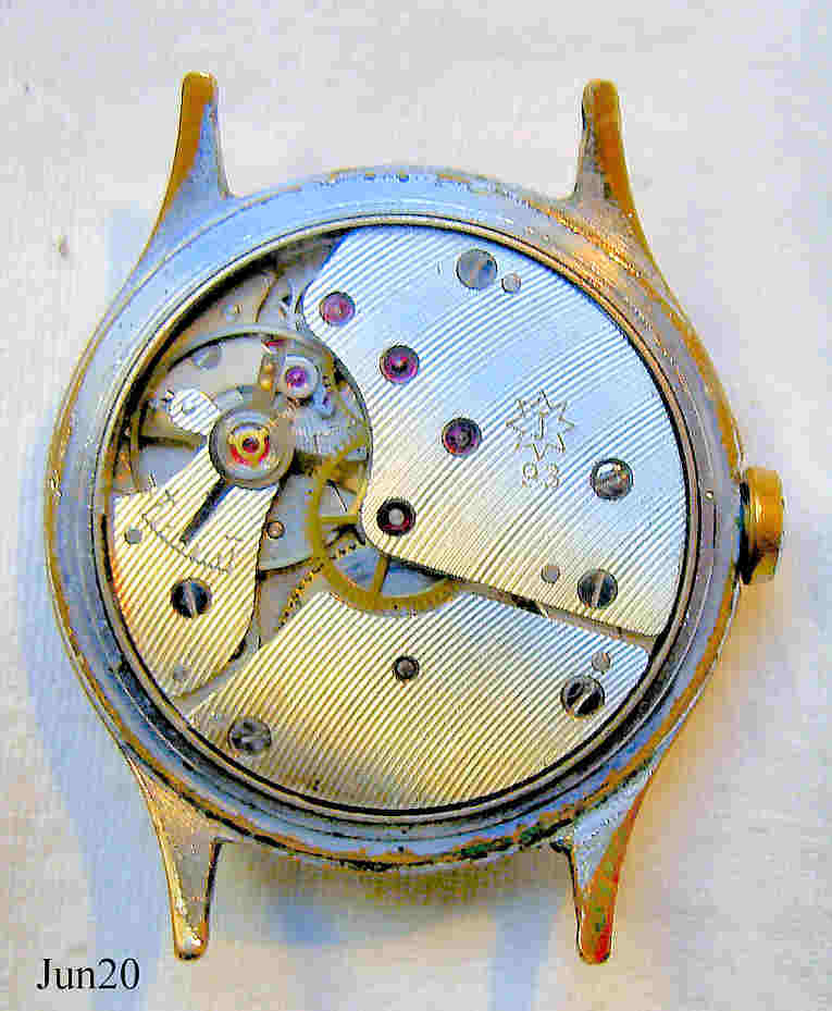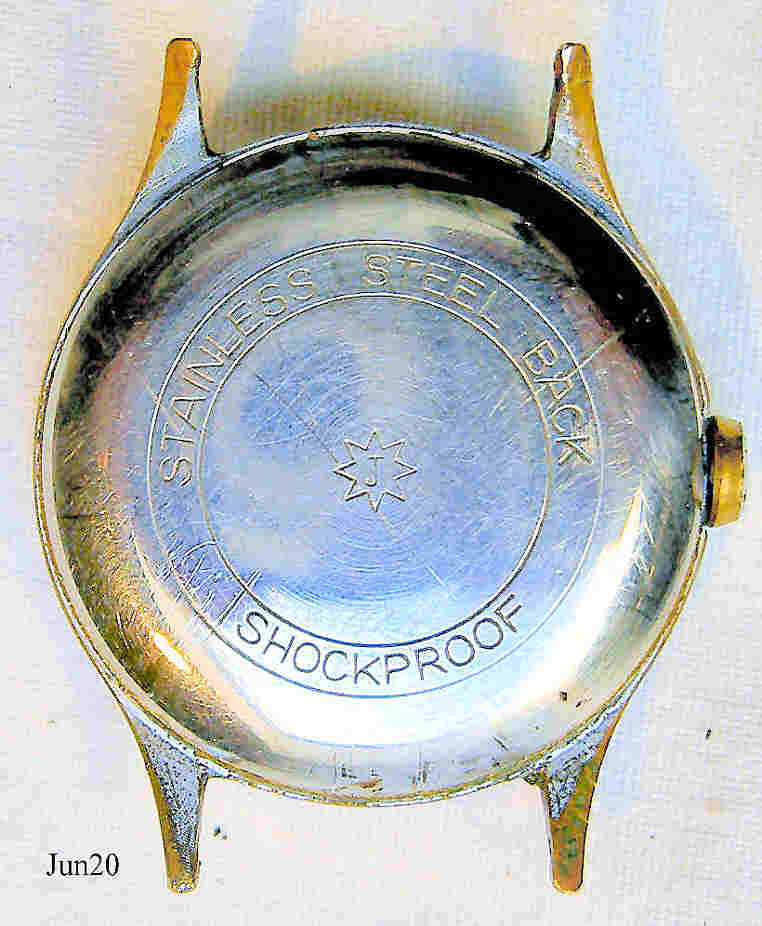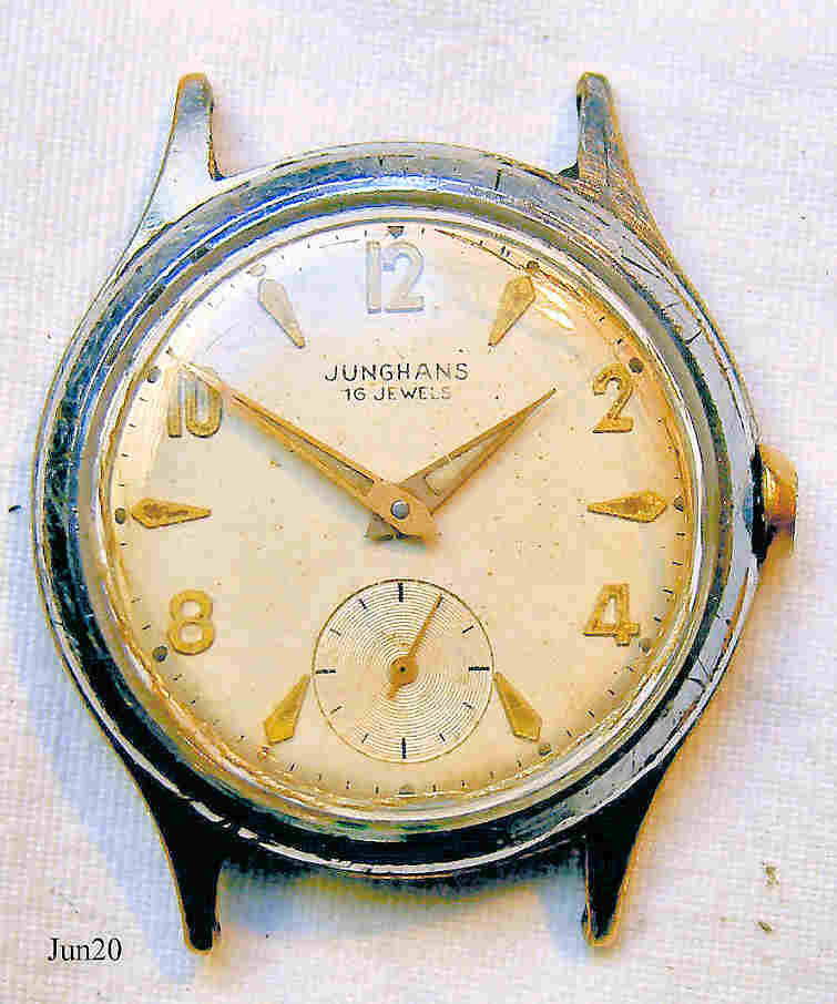Dies ist eine verchromte Junghans Handaufzugsuhr. Beschriftet vorn: ”Junghans, 16 Jewels”, hinten: ”Shockproof, Stainless Steel Back, Junghans Logo in der Mitte”, innen: “Junghans Logo, 93”. Sekundenzeiger bei der 6. Caliber Junghans 93 (EJ 93)