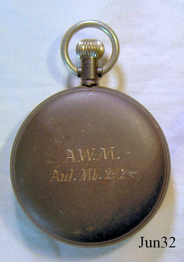 Eine Junghans Stoppuhr mit schwarzem Base Metal Gehäuse. Zeiger und Ziffern in schwarz, Zifferblatt cremefarben. Beschriftet außen: “Junghans”, Innen: ”Junghans, 29a, 98697”, hinten: ”A.W.M., Anl. Mb. 29/2” Kaliber Junghans 29a.