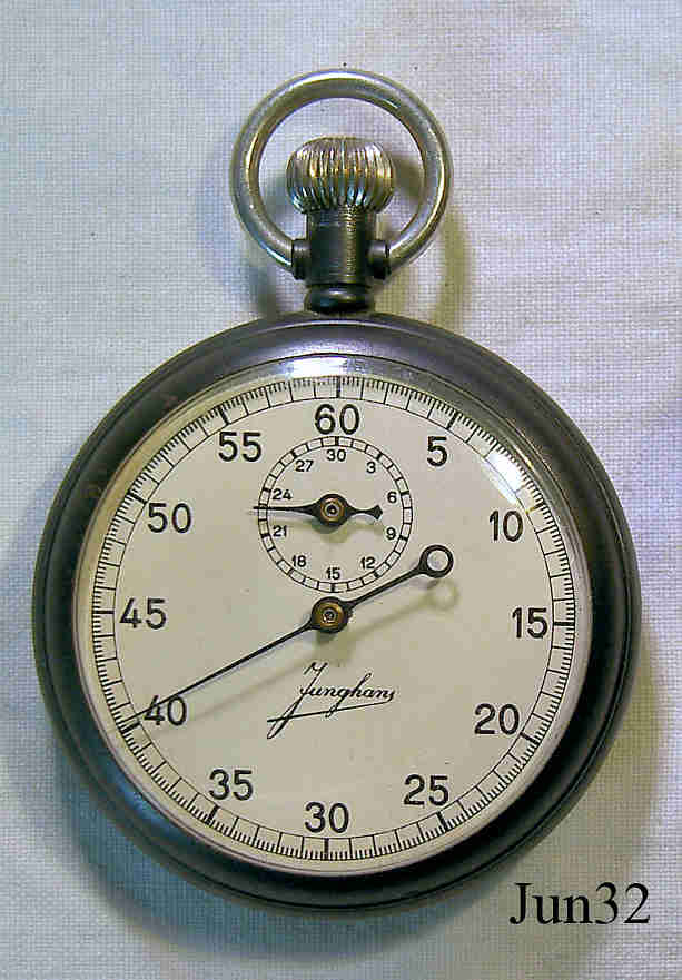 A Junghans Stopwatch with black Base Metal Case. hands and Numbers in black,dial in cream color. Signed front: “Junghans” Inside: ”Junghans, 29a, 98697”, back: ”A.W.M., Anl. Mb. 29/2” Caliber Junghans 29a.