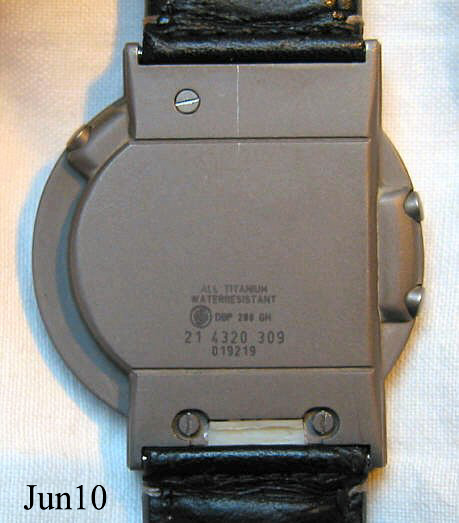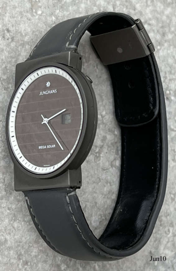 Eine Junghans Mega Solar Armbanduhr mit Kalender und Titangehäuse. Das Zifferblatt ist eine große Solarzelle, die bei Sonnen Einstrahlung Strom erzeugt und in einem Kondensator speichert. Dieser Kondensator treibt dann eine normale Funkuhr an, die die Signale der DCF77 Uhr empfängt und umsetzt. Inschrift vorn: ”Junghans, Mega Solar, Germany”, hinten: ”All Titanium, Waterresistant, DBP 288 GH, 21 4320 309, 019219”. Graues Lederarmband mit eingebauter Antenne. Die Digitalanzeige zeigt wahlweise die Sekunden oder das Datum.