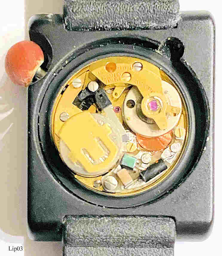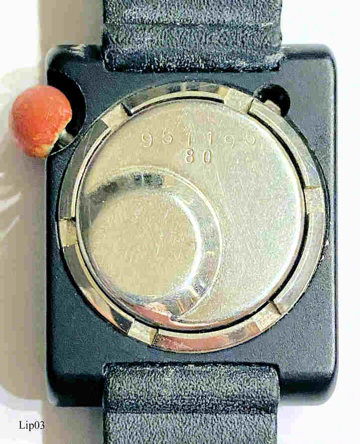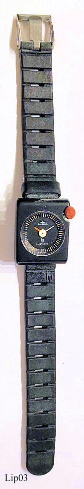 Eine sehr interessante Lip Damen Electronic Uhr ganz in Schwarz, gestaltet von Roger Tallon in seiner berühmten Serie mit den großen Kugelknöpfen. Inschrift vorn: ”Dugena, Lip, Electronic, Made in France”, hinten: ”951185, 80”, innen: ”14 Fourteen Jewels unadjusted”. Kautschukarmband ebenfalls in schwarz mit sehr breiter Schließe. Caliber Lip RE50, ETA 9190.