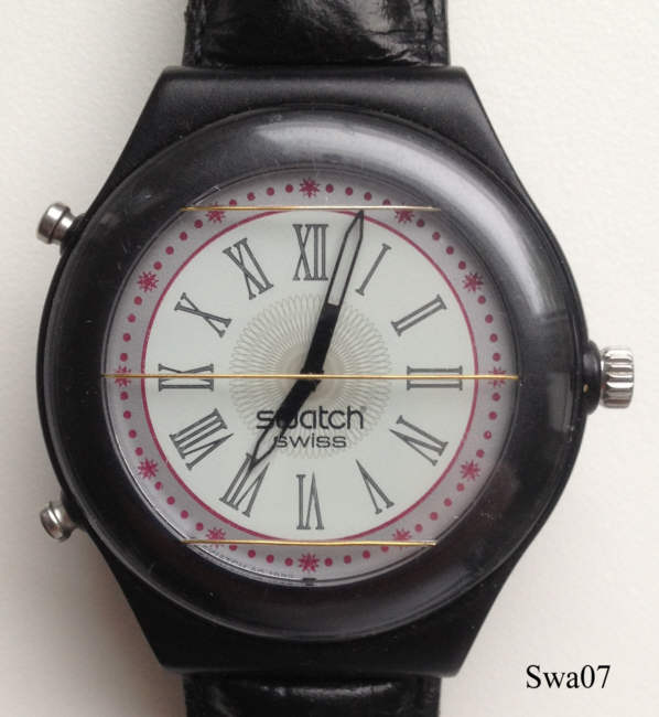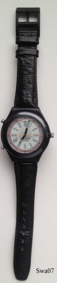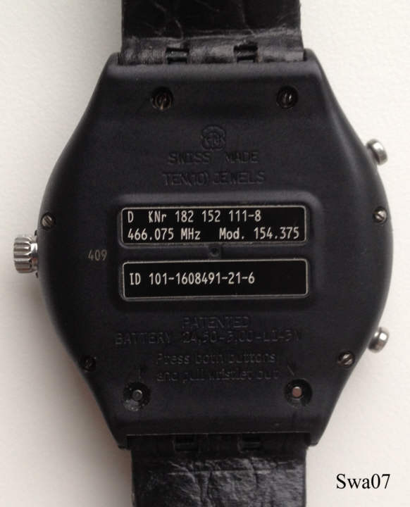 Eine Swatch ”The Beep” mit eingebautem Pager. Beschriftet vorn: “Swatch, Swiss”, hinten: “Swiss Made, Ten (10) Jewels, patented, Battery 24,50- 3,00 Li 3V, press both buttons and pull wristlet out, D KNr 182 152 111-8, 466,075 MHz Mod. 155.375, ID 131-1608491-21-6”. Kunststoff Gehäuse mit Leder Armband, die Drähte auf dem Zifferblatt dienen als Antenne.