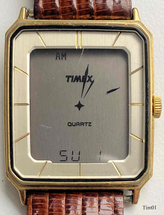 Dies ist eine superflache (5mm) Timex Analoguhr mit einer LCD Anzeige. Die Zeiger werden hier durch LCD Zeigersegmente dargestellt, das Datum ist gleich ebenfalls integriert. Beschriftet vorn: “Timex, Quartz”, innen: “Phillippines, Mod., 437; B17”, hinten: “Timex Z Cell, 80, T, Base Metal Bezel, Stainless Steel back, assembled in Phillippines”. Braunes Eidechs Lederband