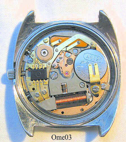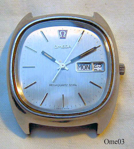 Eine Omega Megaquartz Uhr, Werk Caliber 1310, 8 Steine, Werknummer 35878941, Gehäuse Nr. 1960038, Edelstahlgehäuse, Beschriftet: ”Omega, Megaquartz 32KHz, Swiss Made”, innen: ”Eight 8 Jewels, unadjusted, 35878941”. Datum und Kalender bei der 3.