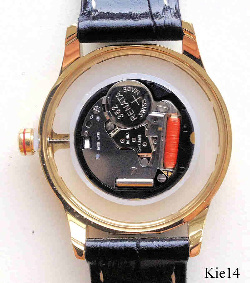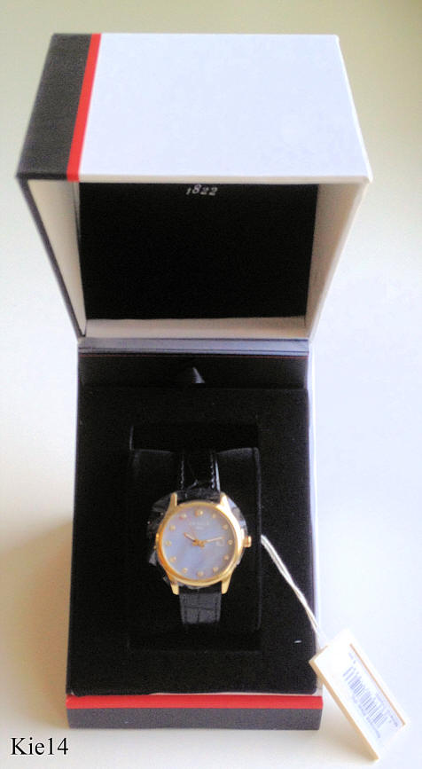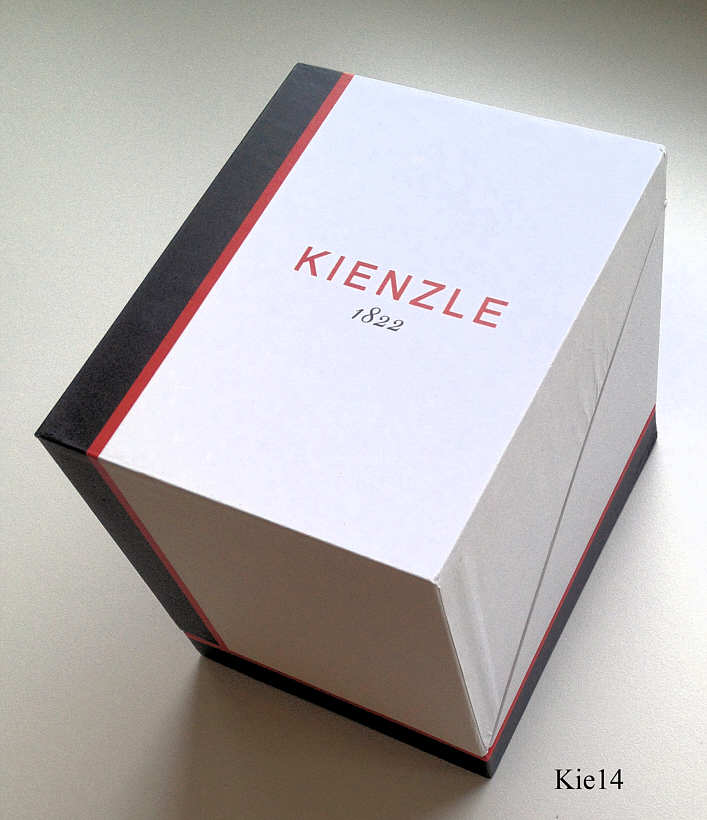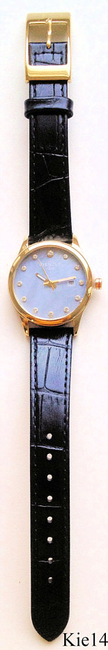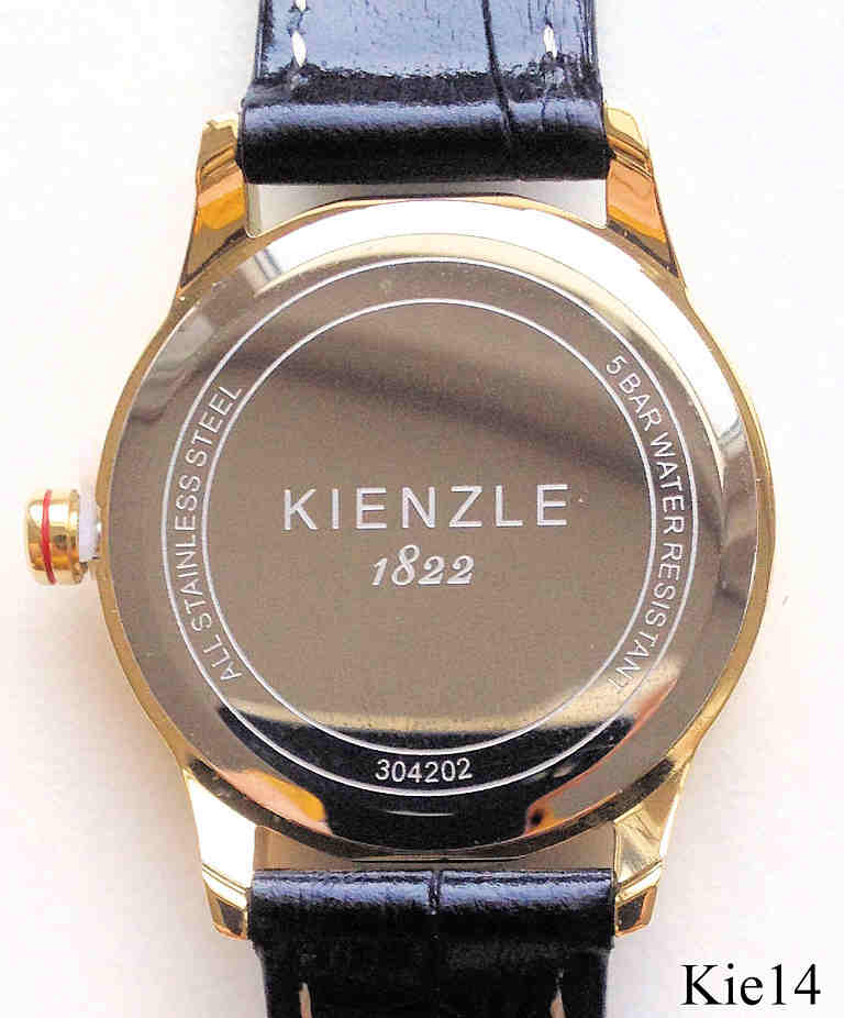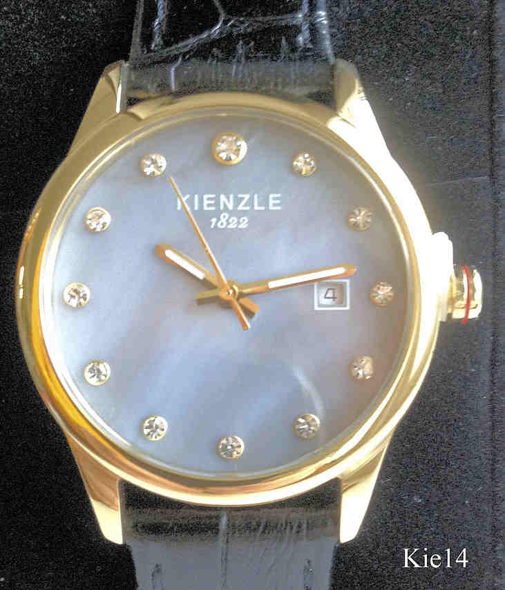 Dies ist eine Quartz Damen Armbanduhr von Kienzle. Das Zifferblatt ist aus Perlmutt mit Zirkonen für die Ziffern, Kalender bei der 3. Beschriftet vorn: ”Kienzle, 1822”, Rückseite: ”Kienzle, 1822, All Stainless Steel, 5 Bar Water Resistant, 304202”. Gehäuse Edelstahl vergoldet, Durchmesser 31 mm, schwarzes Lederarmband. Kaliber Ronda.