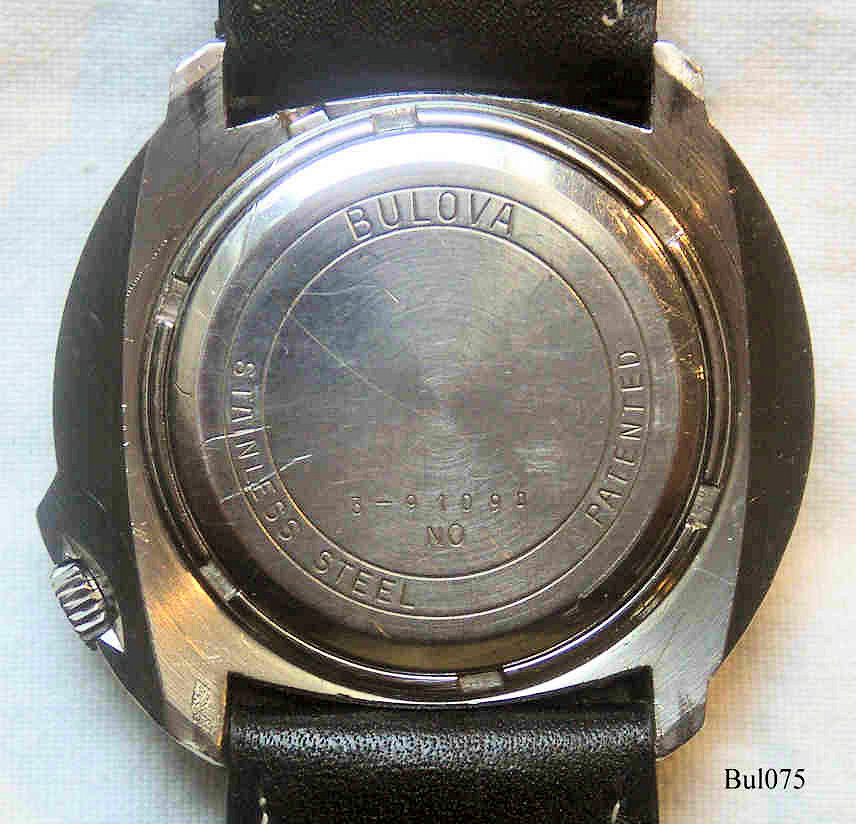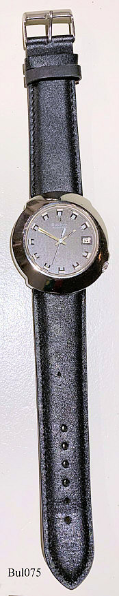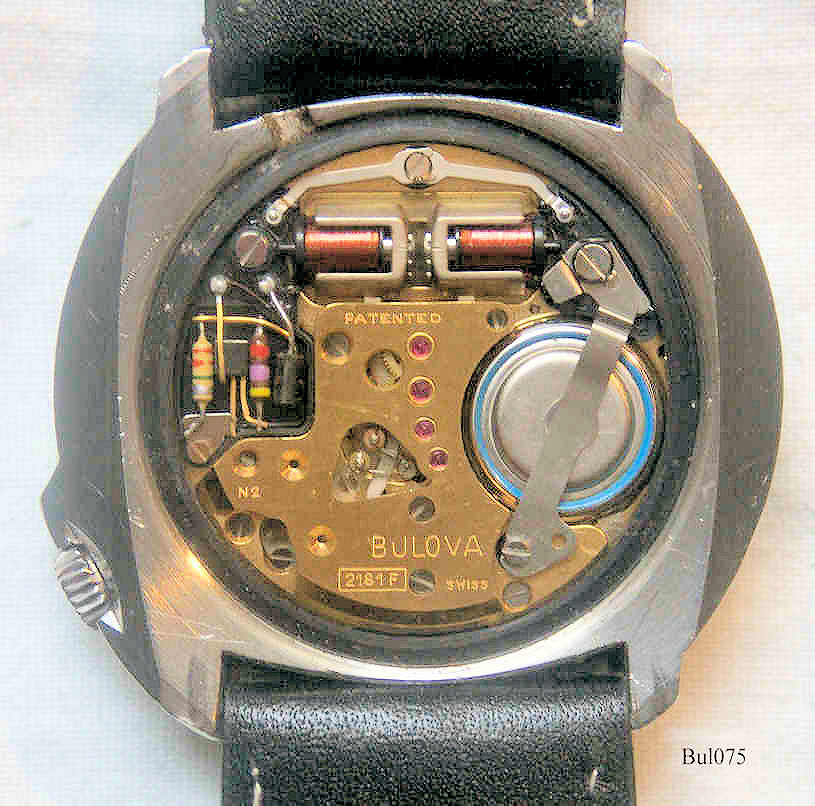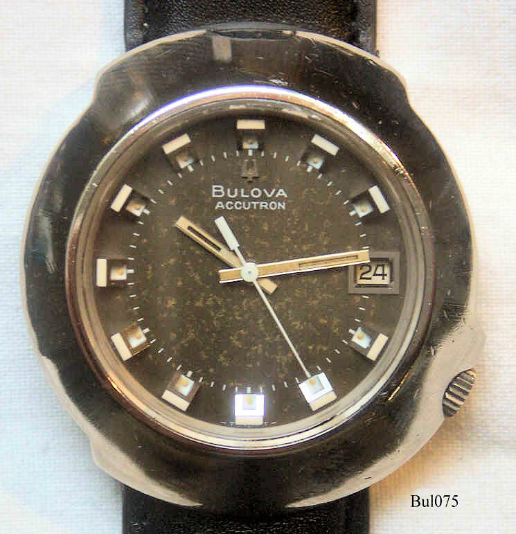 Eine Bulova Accutron mit großem Edelstahlgehäuse, Beschriftet vorn: “€¯Bulova, Accutron”€¯, hinten: “Bulova, Stainless Steel, Patented, 3-091094, N0”€¯, innen: “Patented, Bulova, 2181F, Swiss”€¯, Caliber: 2181F, Herstelldatum 1970 (N0), Case # 852, verschraubter Boden, Date in weiß bei der 3, Krone bei der 4, Zifferblatt in dunkelbraun gesprenkelt, schönes Lederarmband mit neutraler Schließe. Das Kaliber 2181F schaltet über einen elektrischen Kontakt beim Ziehen der Krone den Schwingkreis ab.
