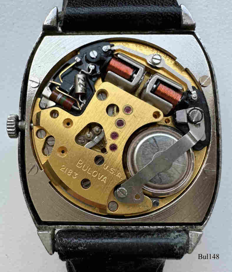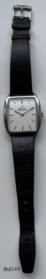 Bulova Accutron with rectangular stainless Steel case without sweep second hand, white dial. Signed front: “Bulova, Accutron”, back: ”BULOVA, 1-794948, M9”, inside: “USA, BULOVA, 2183”, Case # 769-1, Caliber 2183, crown at 3, white dial, manufacturing date 1969 (M9), black leather band.