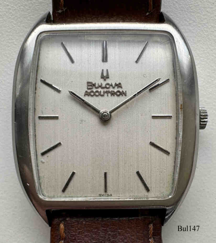 Eine Bulova Accutron mit ovalem 10 K vergoldetem Gehäuse ohne Zentralsekunde, goldenes Zifferblatt, Beschriftet vorn: ”Accutron”, hinten: “BULOVA, H594931, N0”, innen: “U.S.A. Bulova, 2183”. Case # B3022,  Kaliber 2183, Herstelldatum 1970 (N0), Krone bei 4, integriertes 10K vergoldetes Champion Gliederarmband.