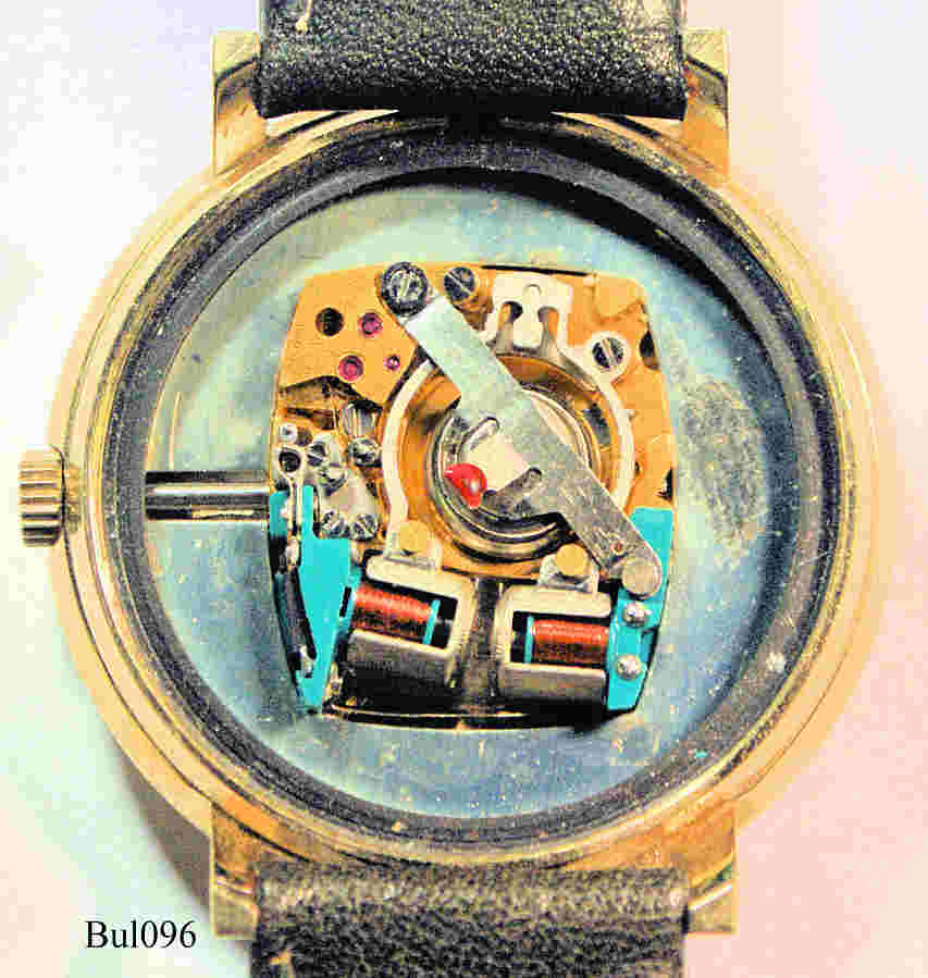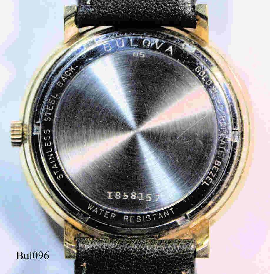 Eine Bulova Accutron mit vergoldetem Gehäuse, Beschriftet vorn: ”Bulova, Accutron”€¯, hinten: ”I858157, Bulova, Gold Electroplate Bezel, Water resistant, Stainless Steel back, N5”€¯, innen: ”Bulova, USA, 2210, N5”, Caliber: 2210, Herstelldatum 1975 (N5), Case # 3440, verschraubter Boden, braunes Lederarmband.