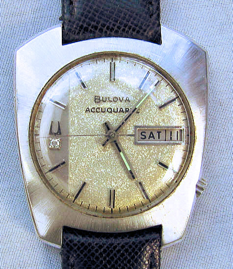Bulova Accuquartz watch with base metal case, signed front: “Bulova, Accuquartz”, back: “Bulova, Base Metal Bezel, Water Resistant, Stainless Steel Back, N6, F477138”, inside: “USA, Bulova, 2242”, .Case # G3628, Caliber 2242, date of munafacture 1976 (N6), Day/Date at 3, crown at 4. This is the last tuning fork caliber, where the tuning for is only used as driver for the hands, the accuracy is achieved by using a quartz timing circuit. Visible mark of Accuquartz is the zirkonia at 9.
