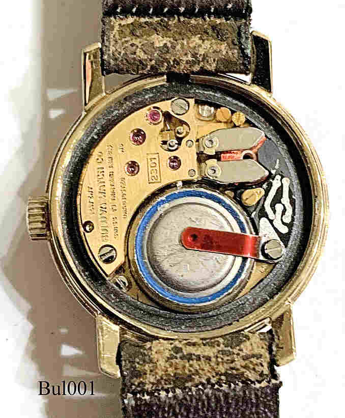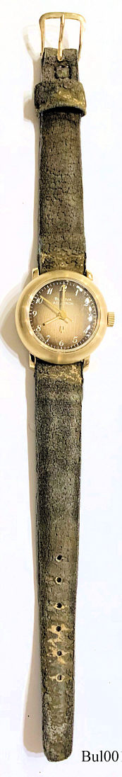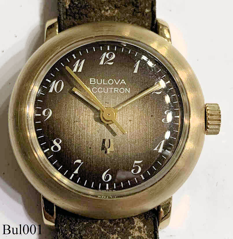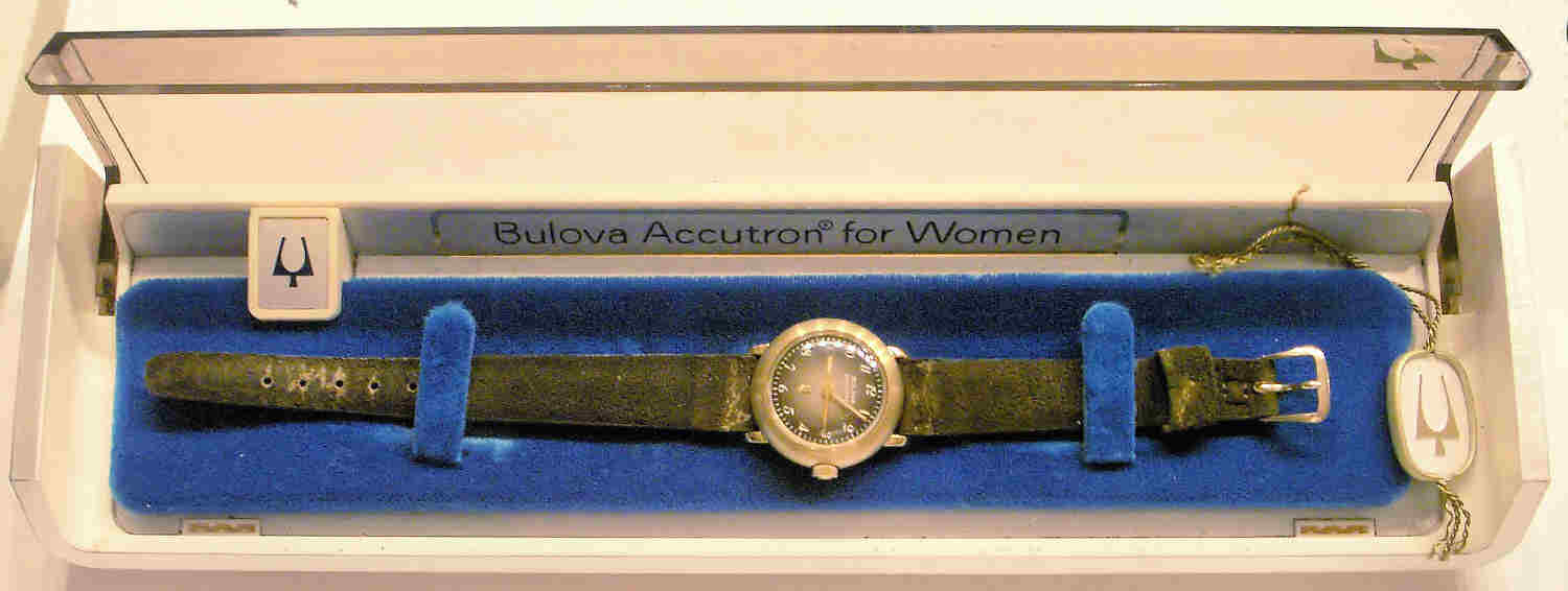 Eine Bulova Accutron Damenuhr mit matt vergoldetem Gehäuse, Beschriftet vorn: “Bulova, Accutron”, hinten: ”Bulova, Patented, Stainless Steel, Water Resistant, N4, F00638, Gravur: R.S.M., 25 Years, Nationwide, Insurance”, innen: ”Patent, BulovaWatch Co., Swiss 13 Thirteen Jewels, Unadjusted, N4, 2301” Caliber 2301, Herstelldatum 1974 (N4), braunes Samtarmband.