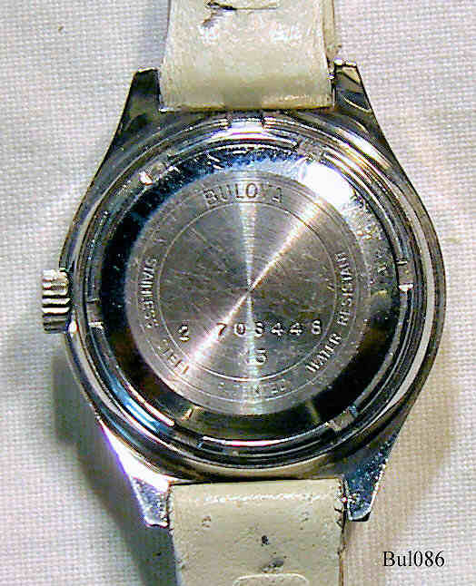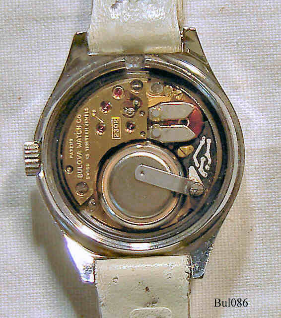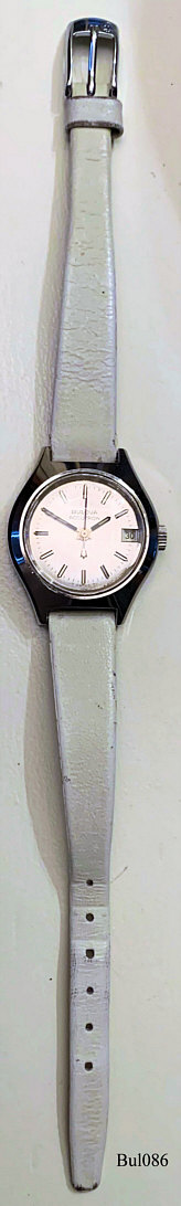Eine Bulova Accutron Damenuhr mit Edelstahl Gehäuse, Beschriftet vorn: “Bulova, Accutron”, hinten: ”Bulova, Stainless Steel, Patented, Water Resistant, N3, 2 708446”, innen: ”Patent, Bulova Watch Co., N2, Swiss, Thirteen 13 Jewels, 2302”, Caliber 2302, Herstelldatum 1973 (N3), Datum bei der 3, weißes Lederarmband.