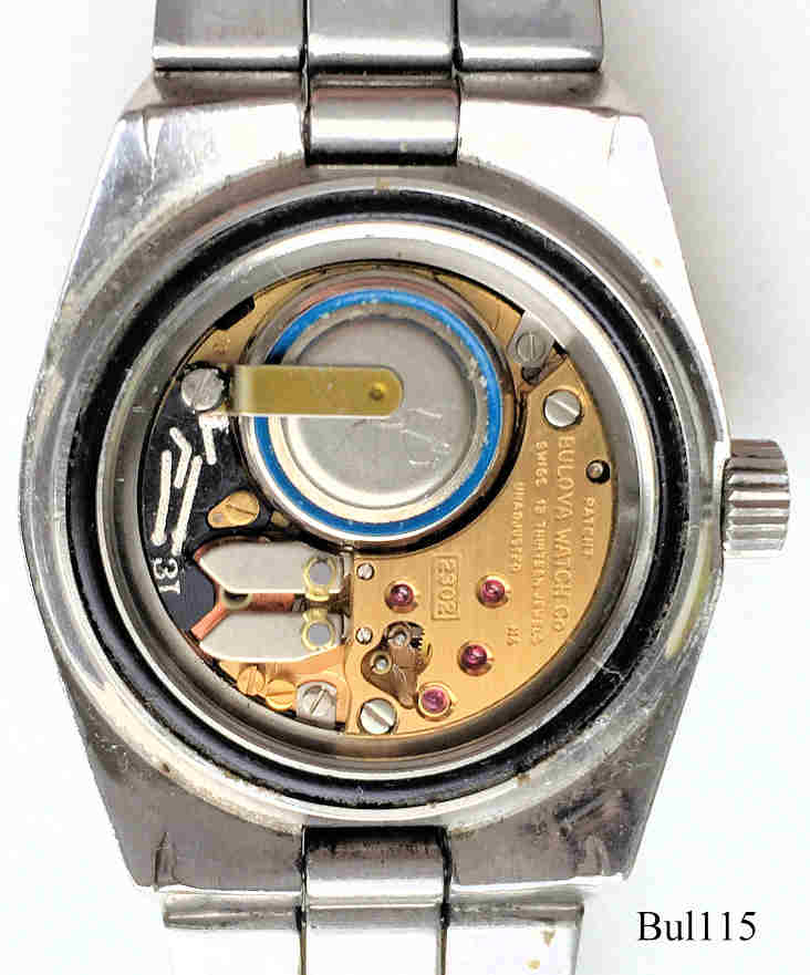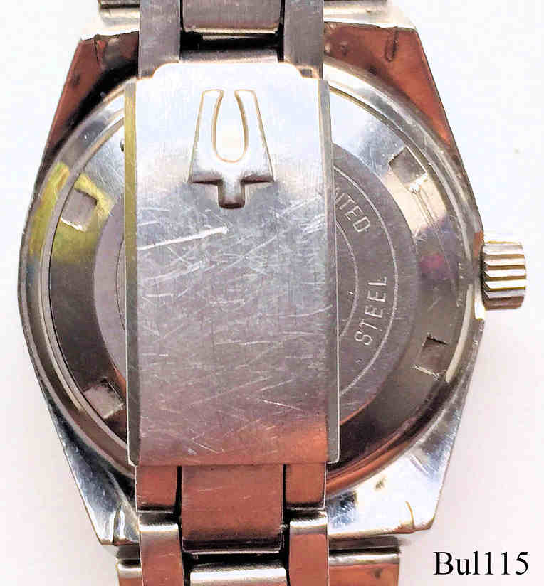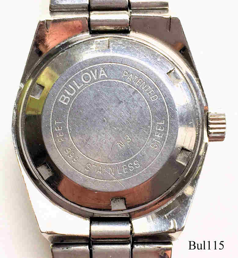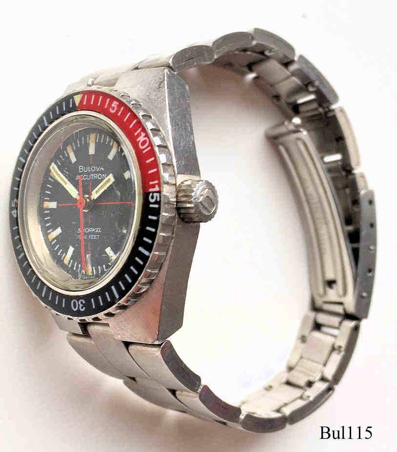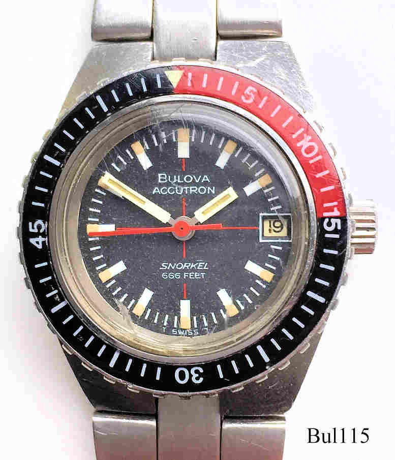 Eine Bulova Accutron Snorkel Damenuhr mit Edelstahl Gehäuse und schwarzem Zifferblatt im Taucher Design, Beschriftet vorn: “Bulova, Accutron, Snorkel, 666 Feet, Swiss”, hinten: ”Bulova, Patented, Stainless Steel, 666 Feet, 604914, N3”, innen: ”Patent, Bulova Watch Co., Swiss, Thirteen 13 Jewels, 2302”, Caliber 2302, Datum bei der 3, Metall Gliederarmband mit Accutron Logo. Die passende Herrenuhr ist hier.
