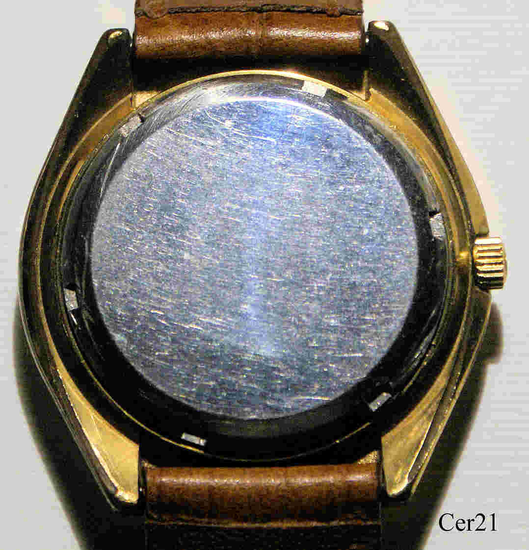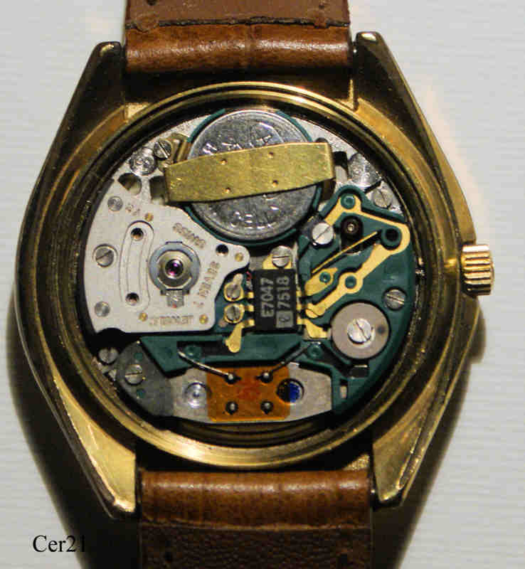 Dies ist eine frühe Certina Quartz Uhr, beschriftet: ”Certina, Quartz, Swiss Made”, innen: ”Seven 7 Jewels, Swiss, Y2”, hinten: ”9106 003, 9405397”. Gehäuse Messing, geschraubter Boden, Kaliber ESA 9181.