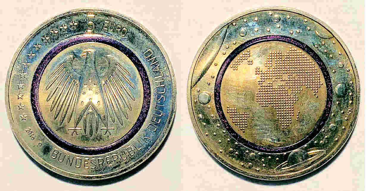 Dies ist eine einfache Quartzuhr zum Gedenken an die Ausgabe der ersten deutschen 5 Euro Münze mit einem transparenten blauen Kunststoff Ring 2016. Beschriftet vorn: ” ”, innen: ”SIIO, PC21S, Singapore, No 0 Jewels”, hinten: ” ”, Schwarzes Lederarmband. Wahrscheinlich wurde diese Uhr von der Firma “ Münzhandelsgesellschaft Deutsche Münze” in Auftrag gegeben.