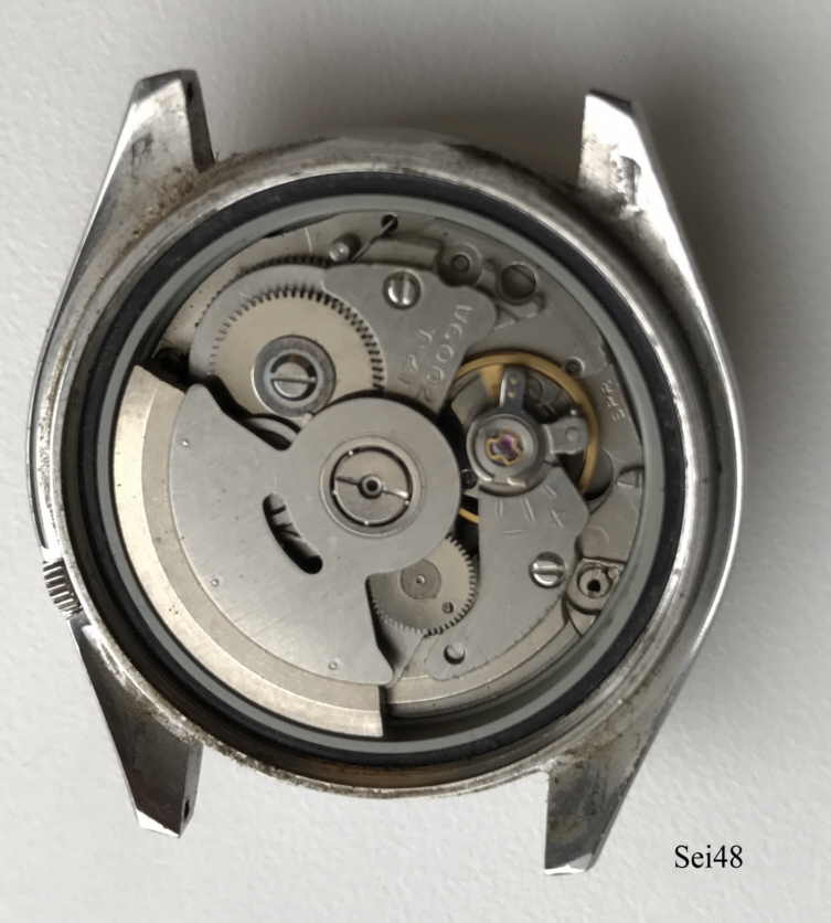 A Seiko 5 Automatic watch with stainless steel case, silver dial and Day/Date display at 3. Signed front:” SEIKO, 5, Automatic, 7009-334 R“, back: “Seiko, Water Resistant, 426249, Stainless Steel, KY, 7009- 4040 A”, inside: “Seiko Time Corp, 7009, Seventeen Jewels” Stainless Steel Case.