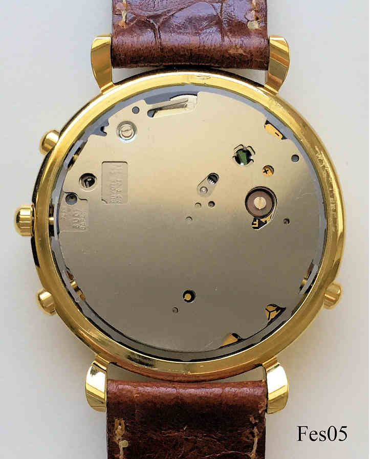 Eine Festina Uhr mit ewigem Kalender, weißem Zifferblatt und 4 Skalen. Bei der 12 ist die Jahreszahl von 1955 bis 2065, bei der 9 ist der Wochentag, bei der 3 ist die Sekunde und der 24 Stunden Anzeiger und bei der 6 ist das Tagesdatum. Auf dem Außenring wird über einen Zeiger der Monat angezeigt. Beschriftet vorn: “Festina, 624604”, hinten: ”Water Resistant, Stainless Steel Back, 6246”, innen: “Miyota Co., No 0 Jewels, 6U01, Japan”. Braunes Lederband.