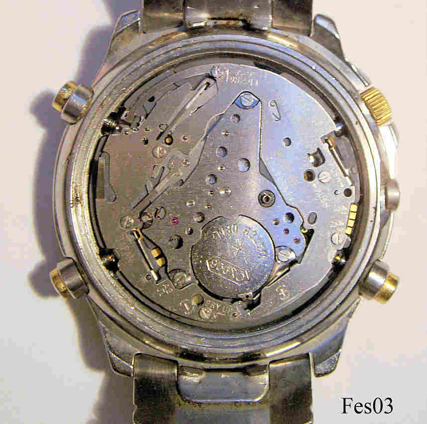 Ein Chronograph von Festina mit weißem Zifferblatt und drei Chronographenskalen in schwarz. Beschriftet: “Festina, Alarm Chronograph, WR100, 650005”, hinten: ”Festina, Water Resistant 10 ATM, Stainless Steel, Modele Depose, 6500”, innen: “Miyota Co., No Jewels, 3S10, Japan” . Datum bei der 4, integriertes Stahlarmband.