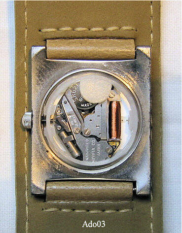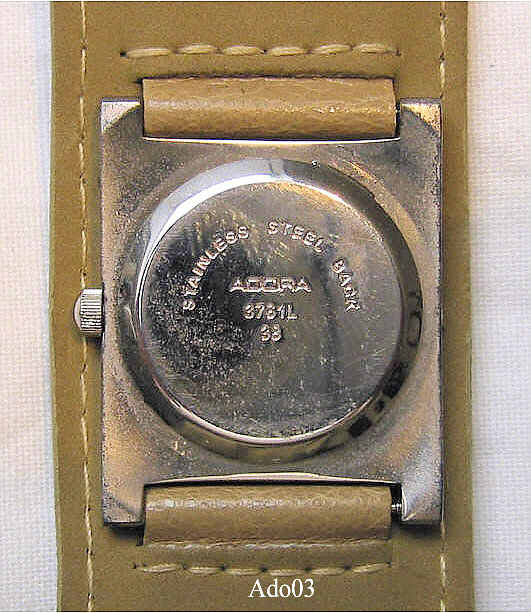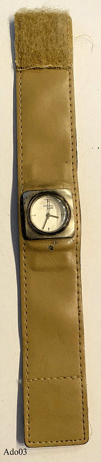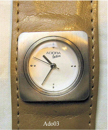 Eine eigenwillige Designuhr der Marke Adora. Die Uhr ist von hinten in ein breites braunes Lederarmband eingesetzt, sodaß vom Gehäuse nur die Zifferblattumrandung zu sehen ist. Der Armbandverschluß ist ein Klettverschluß. Beschriftung: ”ADORA fashion”, hinten: ”Stainless Steel Back, ADORA, 3731L, 33”, innen: ”Unadjusted, Miyota Co., Japan”. Miyota Quartz Uhrwerk, Kaliber Miyota 230-39.