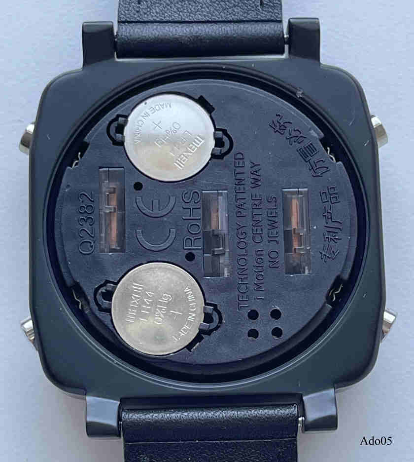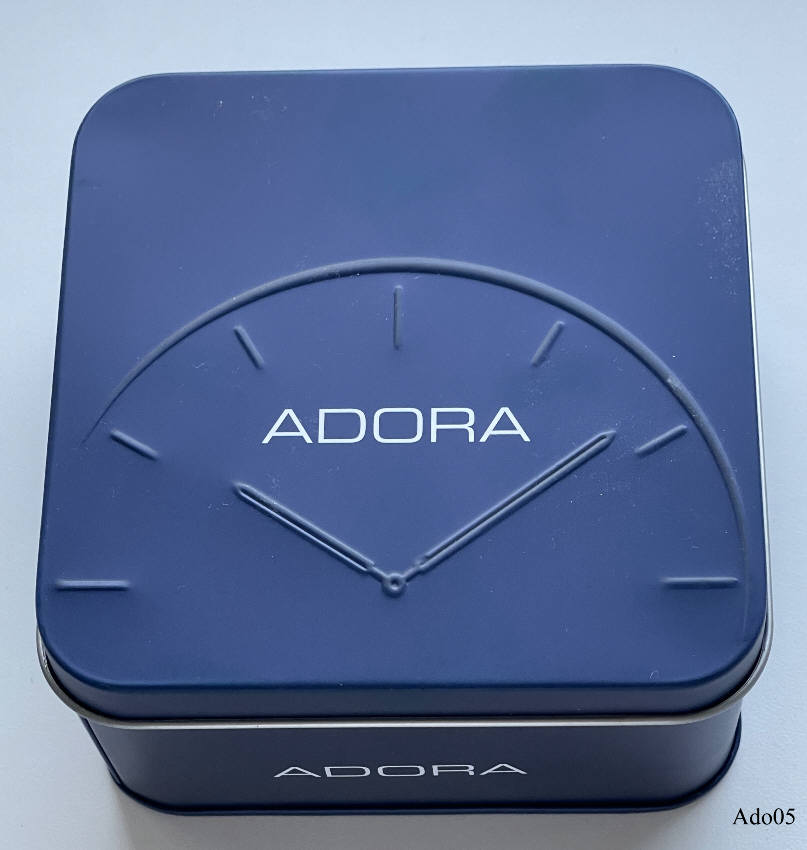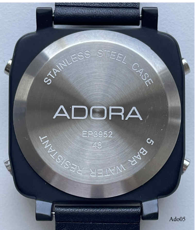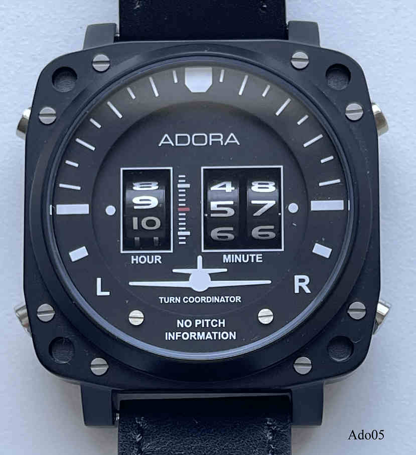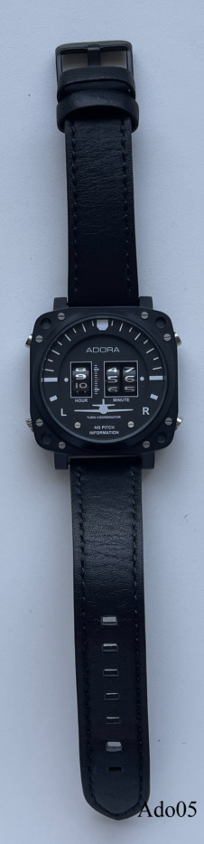 Eine Quartzuhr der Marke Adora im Flugzeug Cockpit Design. Die Zeit wird durch drei Rollen in zwei Fenstern angezeigt. Beschriftung vorn: ”ADORA”, innen: ”Q2382, CE, RoHS, Technology Patented, Motion Center Way, No Jewels”, hinten: ”Stainless Steeel Case, 5 Bar Water Resistant, ADORA, EP3952, 48”